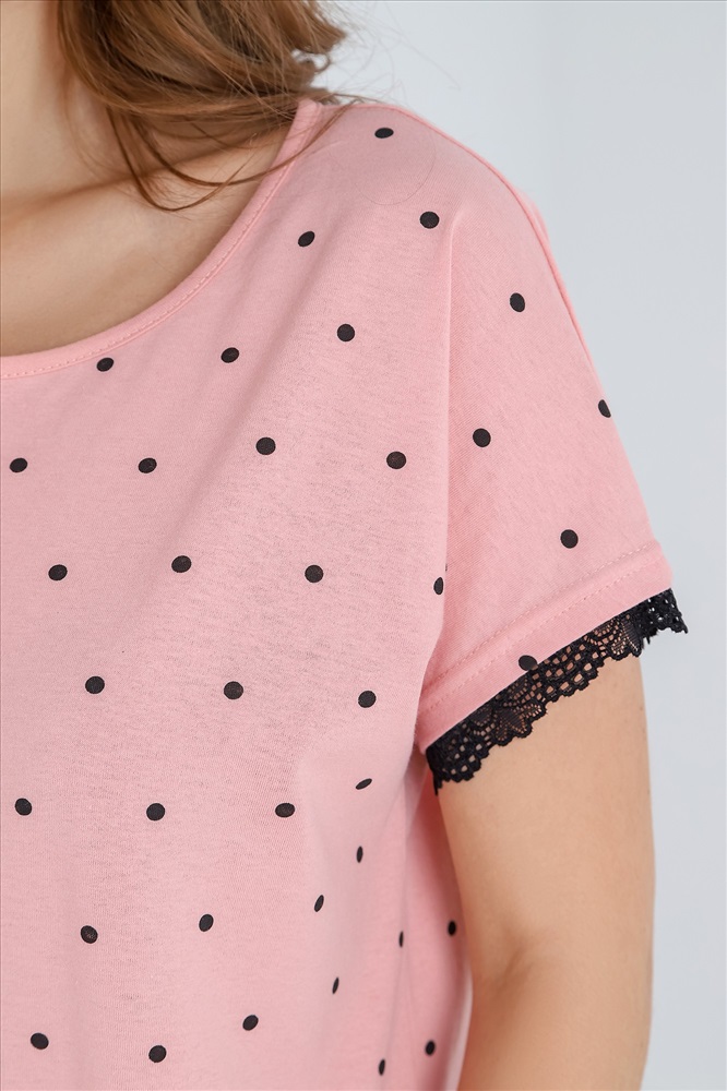 Футболка – из набивного полотна, с короткими цельнокроеными рукавами, по низу отделанными узким кружевом контрастного цвета и горловиной овальной формы, окантованной основным материалом.