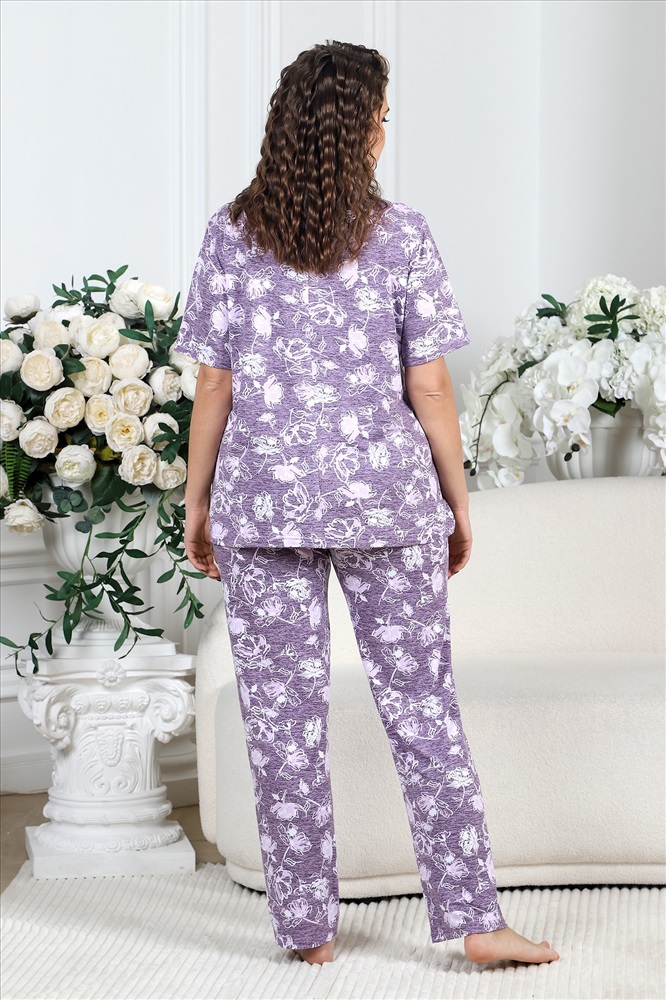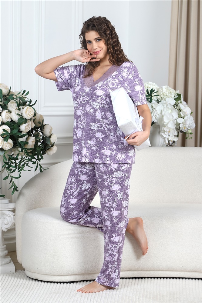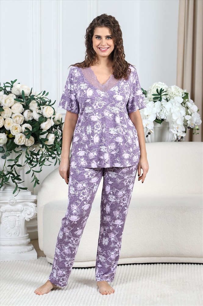 Ткань: Вискоза ВИСКОЗА - это достаточно интересный материал, получаемый из натурального сырья (целлюлозы) искусственным путем. Интересна ткань тем, что она может быть похожа на шелк, шерсть или лен. Все зависит от того, каким способом материал был обработан. Ткань очень приятная и мягкая на ощупь, образовывает на изделиях красивые складки. Из-за своей достаточно высокой гигроскопичности, вискоза способна впитать много влаги, так, например, по сравнению с хлопком, она впитывает ее в два раза больше. Явным преимуществом вискозы является то, что она не электризуется. Пижама женская из вискозного трикотажного полотна с набивным рисунком, состоящая из футболки и брюк. Футболка – прямая, с короткими втачными рукавами. Полочка с V – образными кружевными деталями по горловине.Брюки - свободного покроя с эластичной тесьмой по талии.
