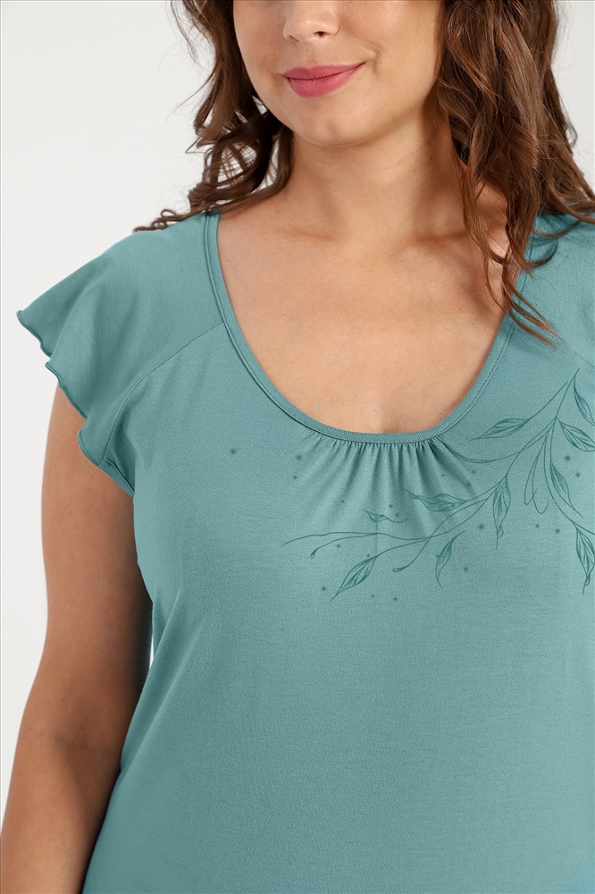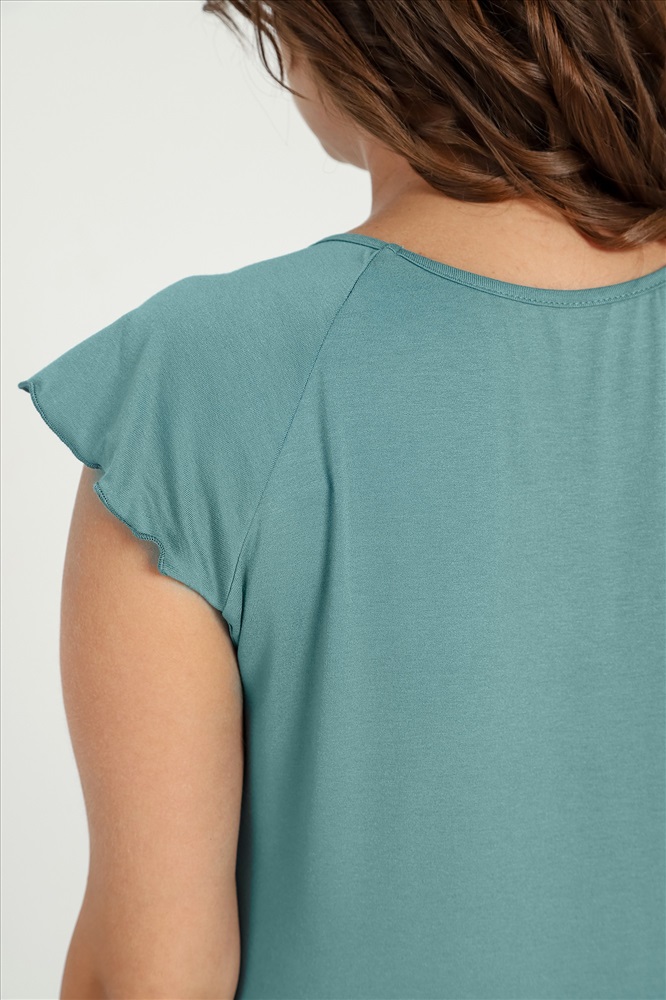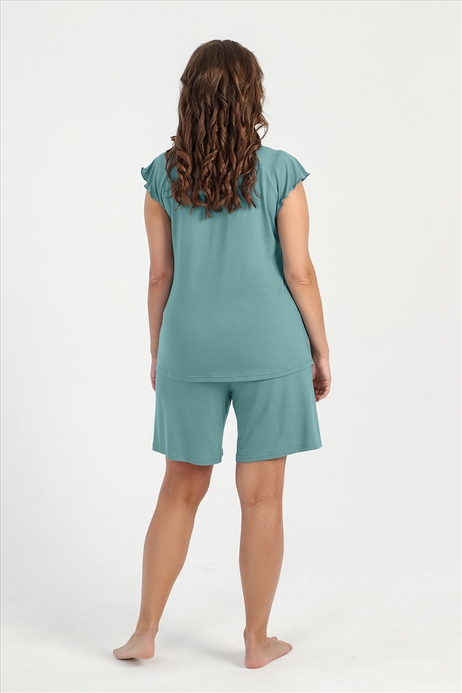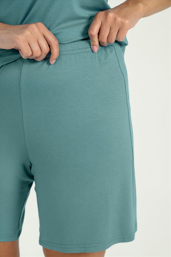 Ткань: Вискоза ВИСКОЗА - это достаточно интересный материал, получаемый из натурального сырья (целлюлозы) искусственным путем. Интересна ткань тем, что она может быть похожа на шелк, шерсть или лен. Все зависит от того, каким способом материал был обработан. Ткань очень приятная и мягкая на ощупь, образовывает на изделиях красивые складки. Из-за своей достаточно высокой гигроскопичности, вискоза способна впитать много влаги, так, например, по сравнению с хлопком, она впитывает ее в два раза больше. Явным преимуществом вискозы является то, что она не электризуется. Пижама женская из гладкокрашенного трикотажного вискозного полотна, состоящая из футболки и шорт. Футболка - слегка расширенная книзу, с короткими рукавами покроя «реглан» и горловиной овальной формы. Проймы и горловина окантованы основным материалом. По срезу горловины выполнена небольшая сборка. Нижние срезы рукавов обработаны узкой обметочной строчкой. Шорты – свободного покроя, удлиненные, с эластичной тесьмой по талии.