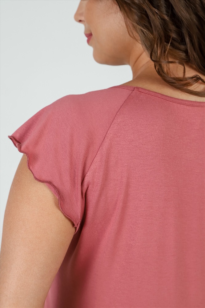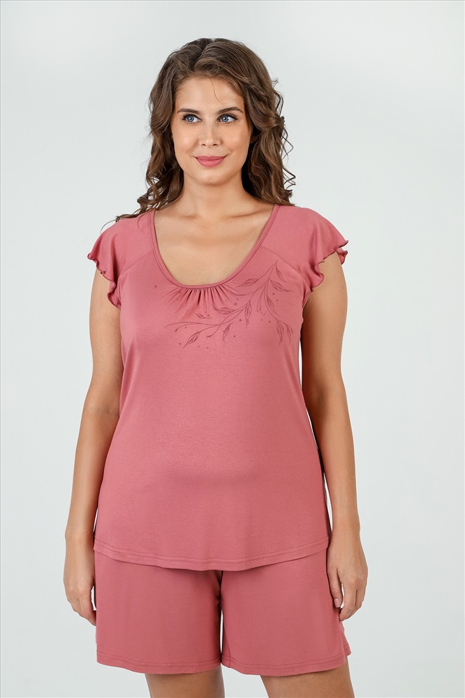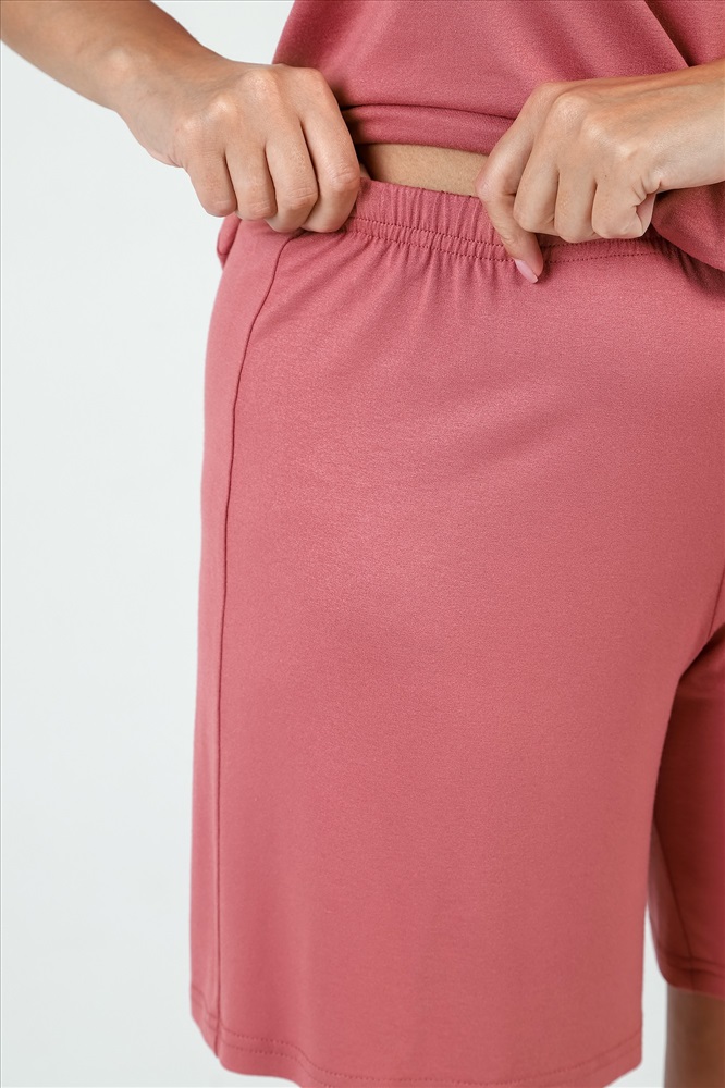 Пижама женская из гладкокрашенного трикотажного вискозного полотна, состоящая из футболки и шорт. Футболка - слегка расширенная книзу, с короткими рукавами покроя «реглан» и горловиной овальной формы. Проймы и горловина окантованы основным материалом. По срезу горловины выполнена небольшая сборка. Нижние срезы рукавов обработаны узкой обметочной строчкой. Шорты – свободного покроя, удлиненные, с эластичной тесьмой по талии.