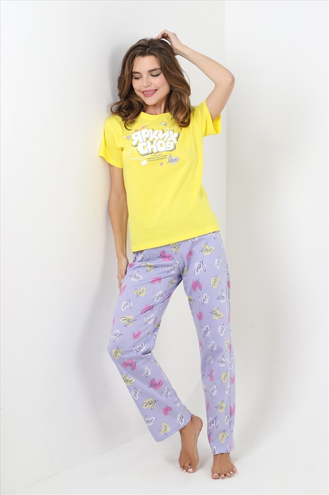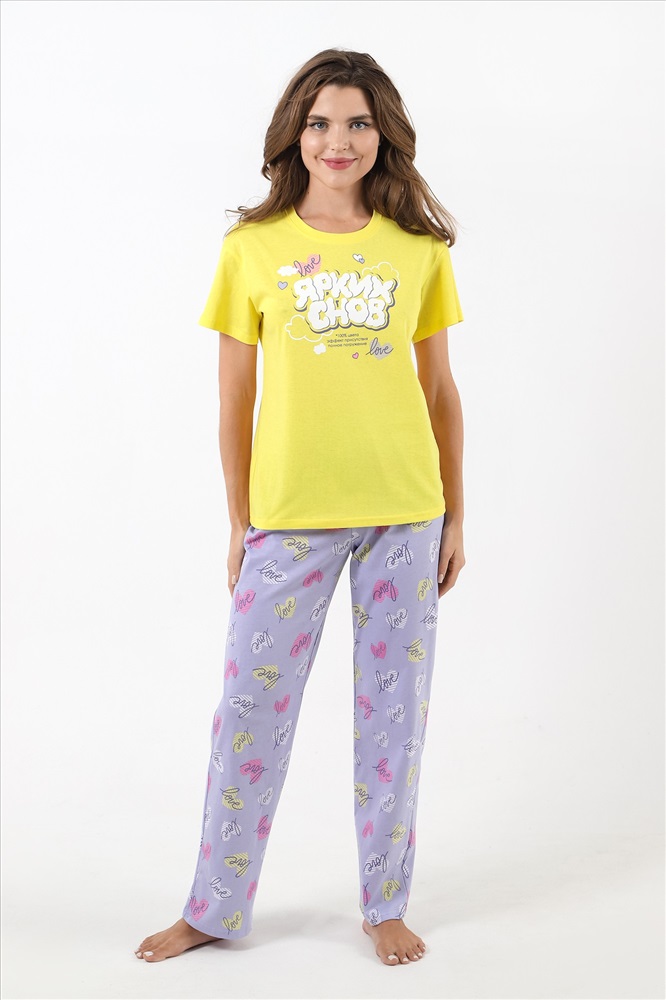 Пижама молодежная из трикотажного полотна «кулирка» в комбинации двух видов: гладкокрашеного и с набивным рисунком, состоящая из футболки и брюк. Футболка – из гладкокрашеного полотна, классического покроя, с короткими втачными рукавами, горловиной овальной формы, обработанной притачной бейкой и принтом на полочке, выполненным в технике «шелкографии».Брюки – из полотна с набивным рисунком, классического покроя, с эластичной тесьмой по талии.