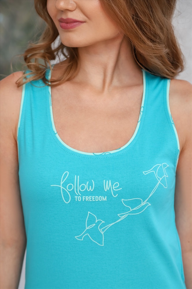 Майка – из гладкокрашеного полотна классического покроя, с горловиной и проймами, обработанными узким кантом из отделочного материала с набивным рисунком и принтом на полочке, выполненным методом шелкографии.