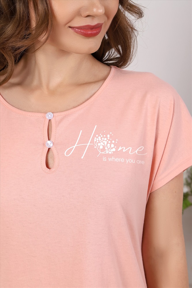 рисунком, состоящая из футболки и бридж. Футболка – из гладкокрашенного полотна классического покроя с короткими цельнокроеными рукавами, горловиной овальной формы. В центре переда выполнен разрез в форме «капли» и украшен двумя декоративными пуговицами.Бриджи из полотна с набивным рисунком свободного покроя расширенные книзу, с эластичной тесьмой по талии.