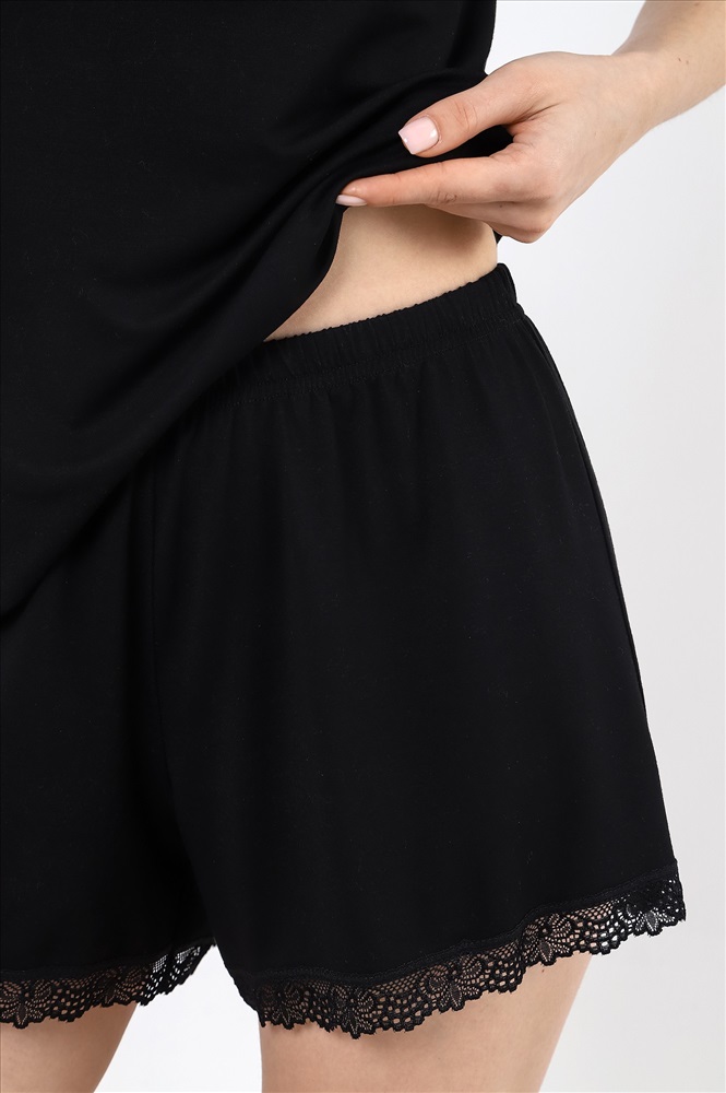 Пижама молодежная из гладкокрашенного трикотажного вискозного полотна, состоящая из футболки и шорт. Футболка - слегка расширенная книзу, с короткими кружевными рукавами покроя «реглан» и горловиной овальной формы. Горловина окантована основным материалом.Шорты – свободного покроя, средней длины, с эластичной тесьмой по талии. Нижние срезы шорт обработаны кружевом.