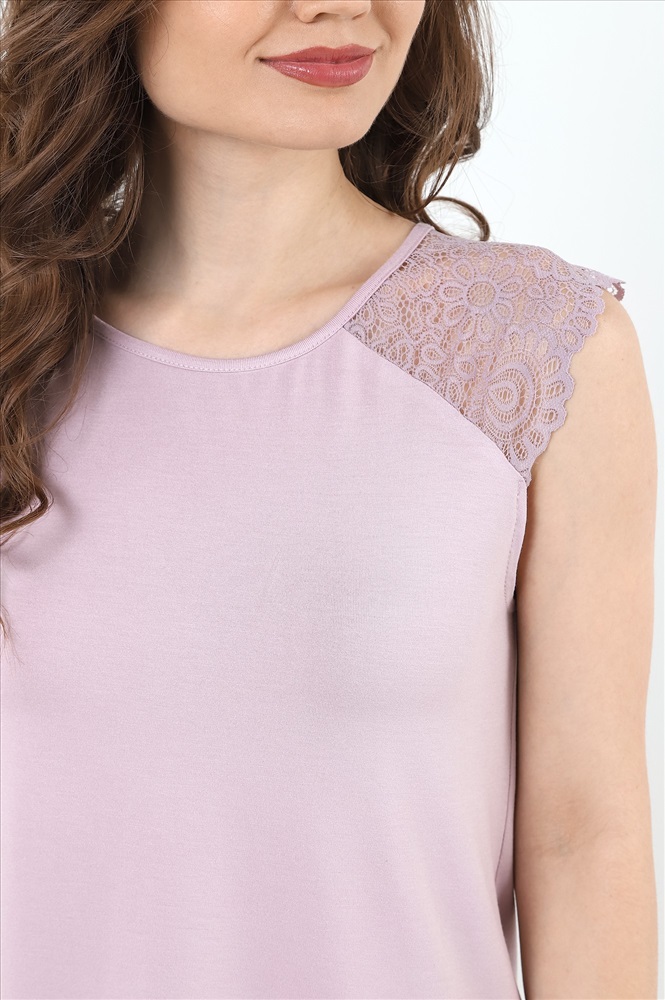 Пижама молодежная из гладкокрашенного трикотажного вискозного полотна, состоящая из футболки и шорт. Футболка - слегка расширенная книзу, с короткими кружевными рукавами покроя «реглан» и горловиной овальной формы. Горловина окантована основным материалом.Шорты – свободного покроя, средней длины, с эластичной тесьмой по талии. Нижние срезы шорт обработаны кружевом.