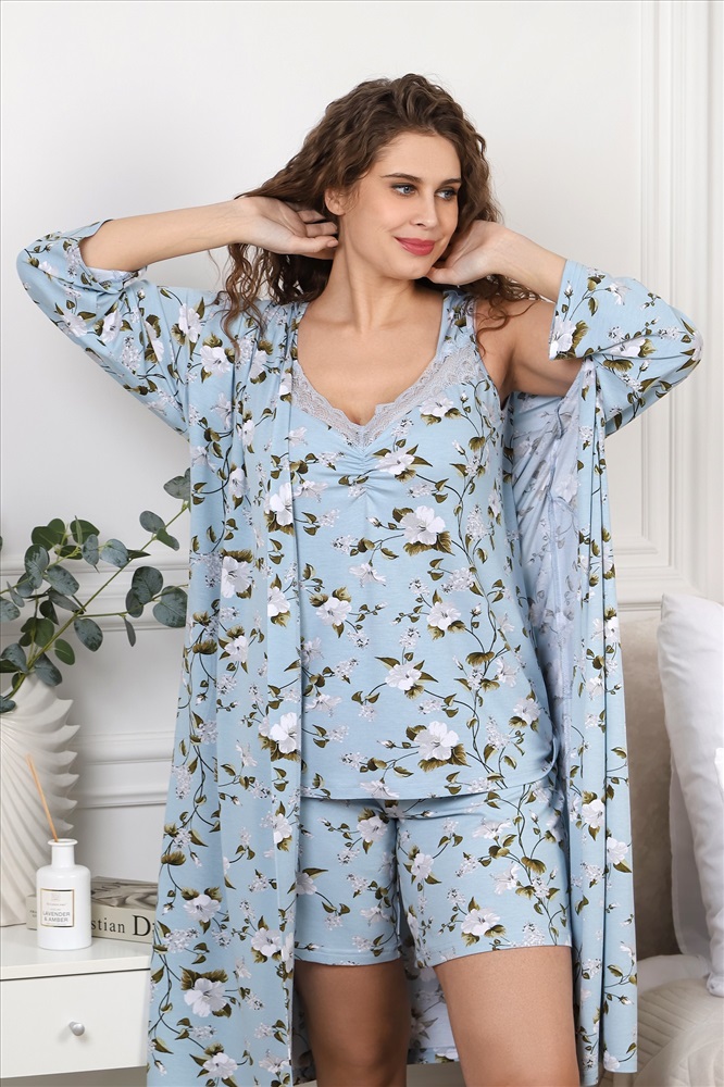Пижама женская из трикотажного вискозного полотна с набивным рисунком, с отделкой кружевом, состоящая из майки и шорт. Майка - слегка расширенная книзу, с кружевной вставкой-кокеткой V-образной формы и небольшой драпировкой в центре груди.Шорты – удлиненные, с эластичной тесьмой по талии.