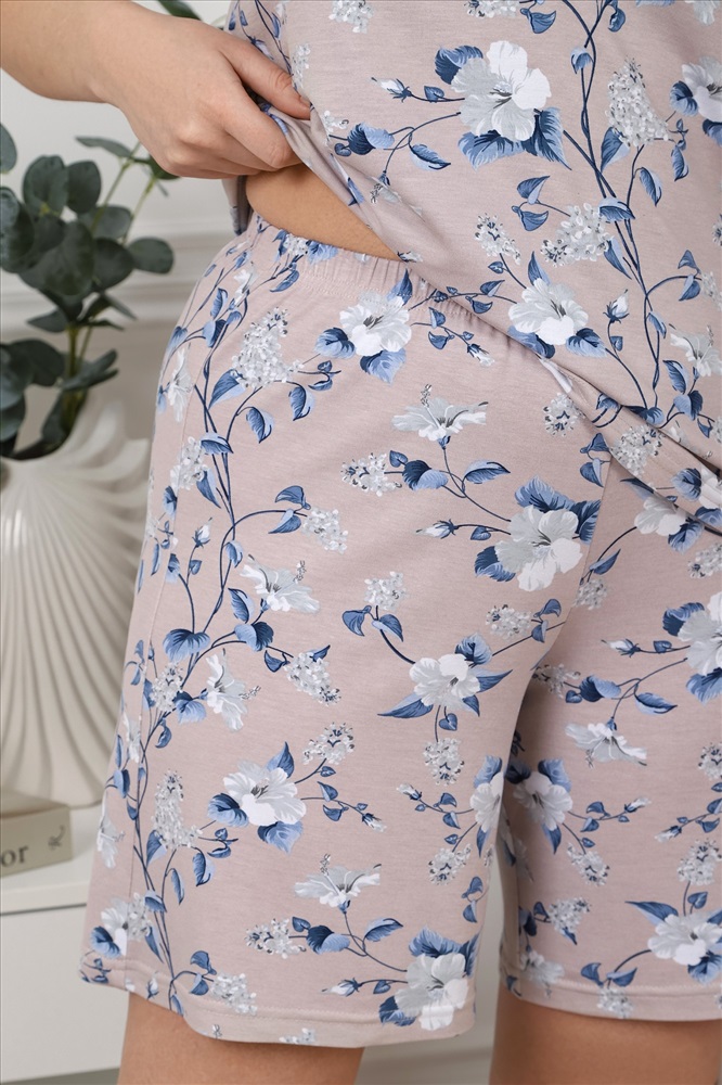 Ткань: Вискоза ВИСКОЗА - это достаточно интересный материал, получаемый из натурального сырья (целлюлозы) искусственным путем. Интересна ткань тем, что она может быть похожа на шелк, шерсть или лен. Все зависит от того, каким способом материал был обработан. Ткань очень приятная и мягкая на ощупь, образовывает на изделиях красивые складки. Из-за своей достаточно высокой гигроскопичности, вискоза способна впитать много влаги, так, например, по сравнению с хлопком, она впитывает ее в два раза больше. Явным преимуществом вискозы является то, что она не электризуется. Пижама женская из трикотажного вискозного полотна с набивным рисунком, с отделкой кружевом, состоящая из майки и шорт. Майка - слегка расширенная книзу, с кружевной вставкой-кокеткой V-образной формы и небольшой драпировкой в центре груди.Шорты – удлиненные, с эластичной тесьмой по талии.