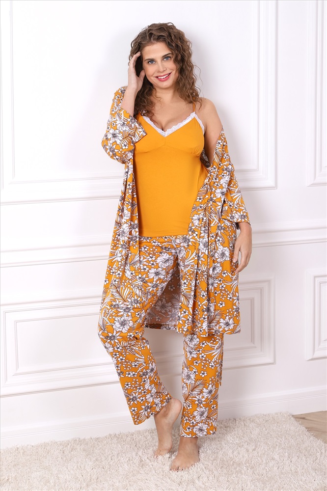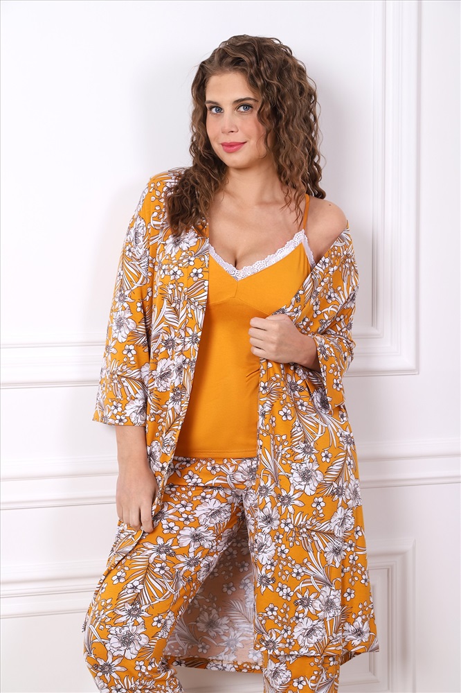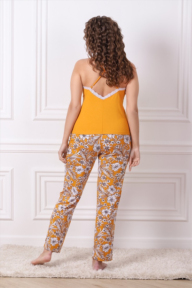 Пижама молодежная из вискозного трикотажного полотна в комбинации двух видов в единой цветовой гамме: гладкокрашеного и с набивным рисунком, состоящая из топа и брюк. Топ – из гладкокрашеного полотна, расширенный книзу, на узких бретелях. Перед – с лифом «бюстье», образующим v-образный вырез горловины и присборенным по швам стачивания с основной деталью. Спинка – со средним швом, с расширенным и углубленным вырезом v-образной формы, являющимся продолжением пройм. По всей длине вырезы горловины переда и спины отделаны кружевом. Узкие бретели, вытачанные из окантовки, перекрещиваются сзади. Для регулирования длины бретелей предусмотрены пластмассовые кольца-держатели и фиксаторы. Брюки – из полотна с набивным рисунком, длинные, с эластичной тесьмой по талии.