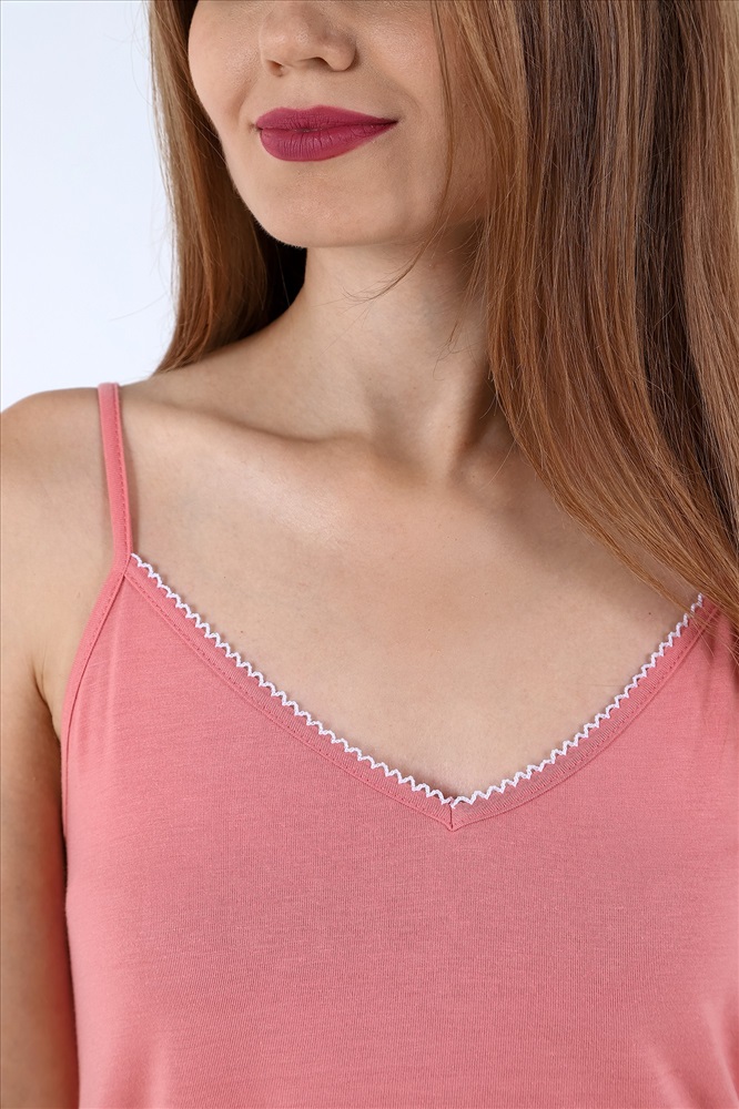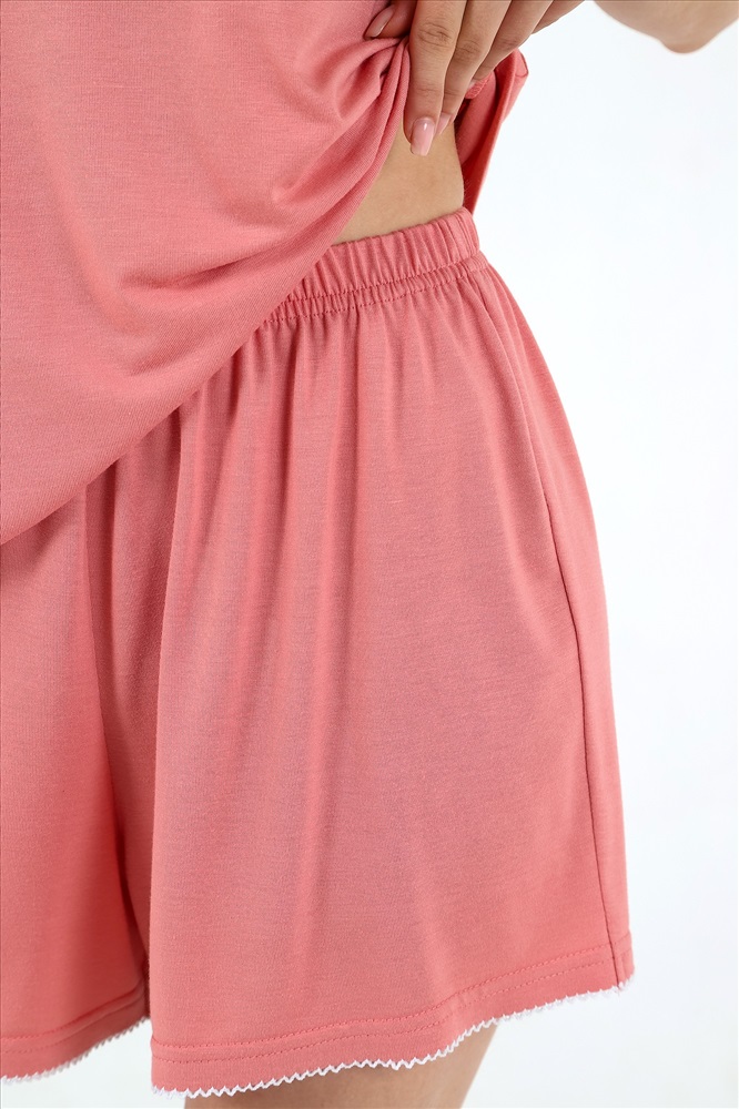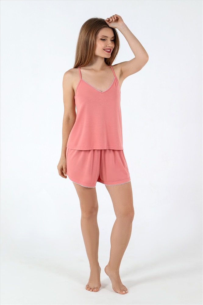 Пижама молодежная из гладкокрашеного трикотажного полотна «джерси», состоящая из майки и шорт. Майка – слегка расширенна книзу, без рукавов, с V-образным вырезом горловины переда и спинки. Горловина окантована основным материалом и дополнительно украшена декоративной строчкой «кроше» нитками контрастного цвета. На спинке - декоративный элемент в виде перекрещенных между собой бретелей. Проймы окантованы основным материалом.Шорты – свободного покроя, средней длины, с эластичной тесьмой по талии.