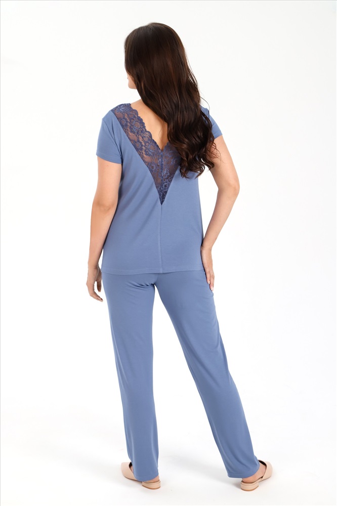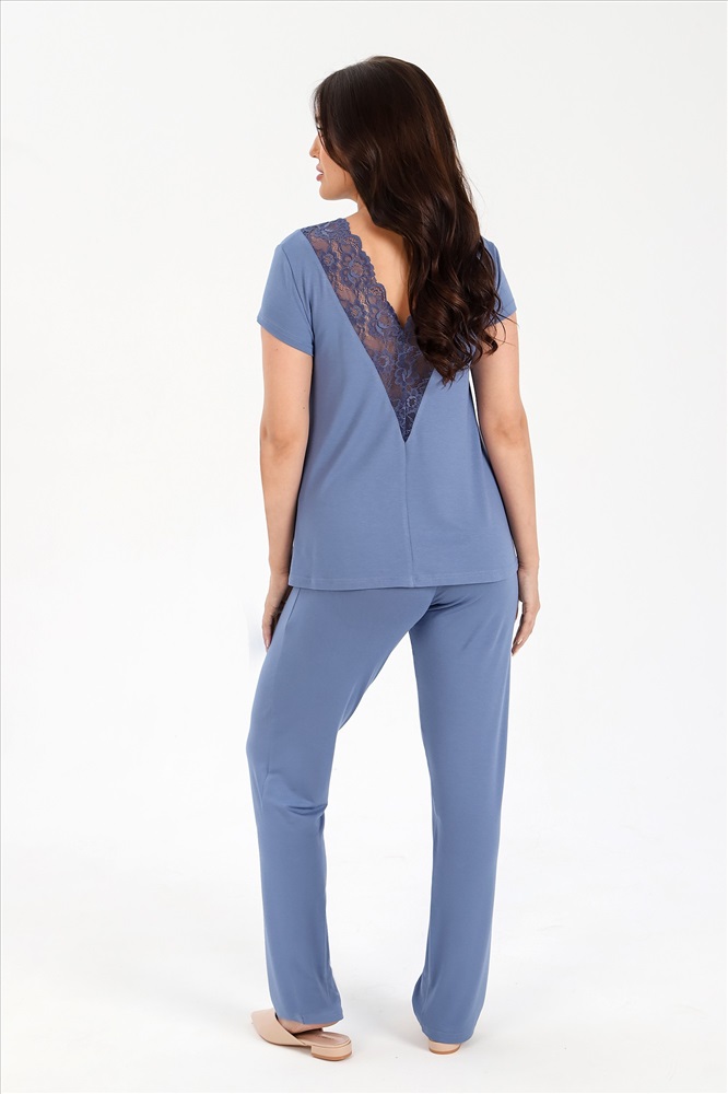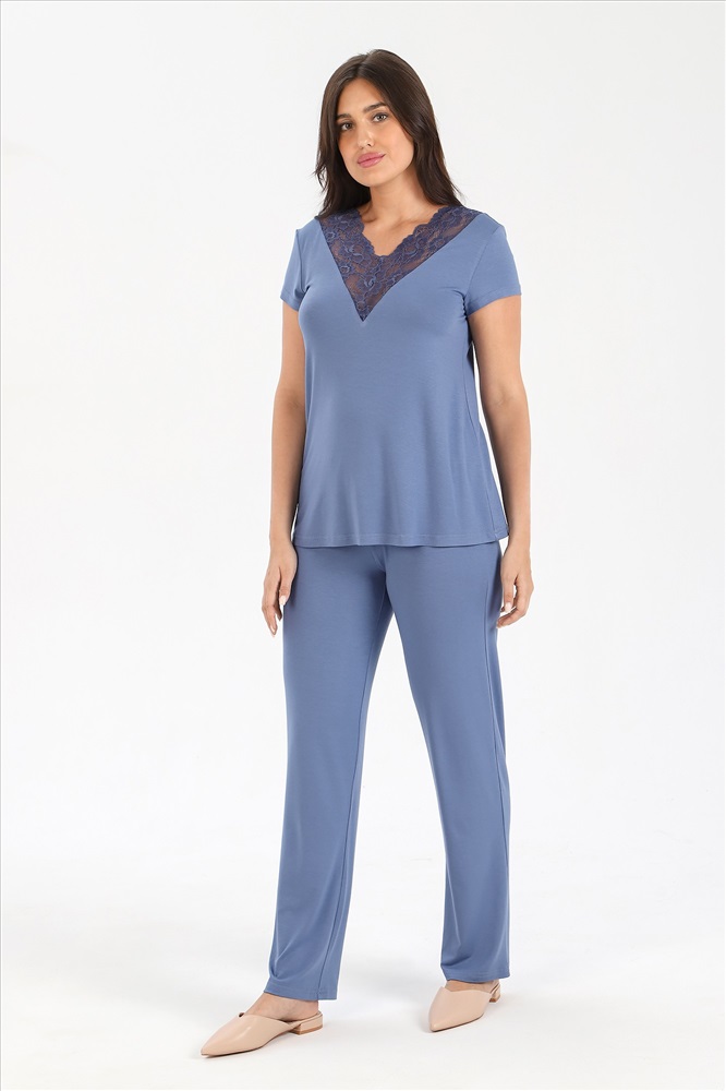 Ткань: Вискоза ВИСКОЗА - это достаточно интересный материал, получаемый из натурального сырья (целлюлозы) искусственным путем. Интересна ткань тем, что она может быть похожа на шелк, шерсть или лен. Все зависит от того, каким способом материал был обработан. Ткань очень приятная и мягкая на ощупь, образовывает на изделиях красивые складки. Из-за своей достаточно высокой гигроскопичности, вискоза способна впитать много влаги, так, например, по сравнению с хлопком, она впитывает ее в два раза больше. Явным преимуществом вискозы является то, что она не электризуется. Пижама из гладкокрашеного вискозного трикотажного полотна, состоящая из футболки и брюк. Футболка - слегка расширенная книзу, с короткими втачными рукавами. Полочка и спинка – с V – образными кружевными деталями по горловине.