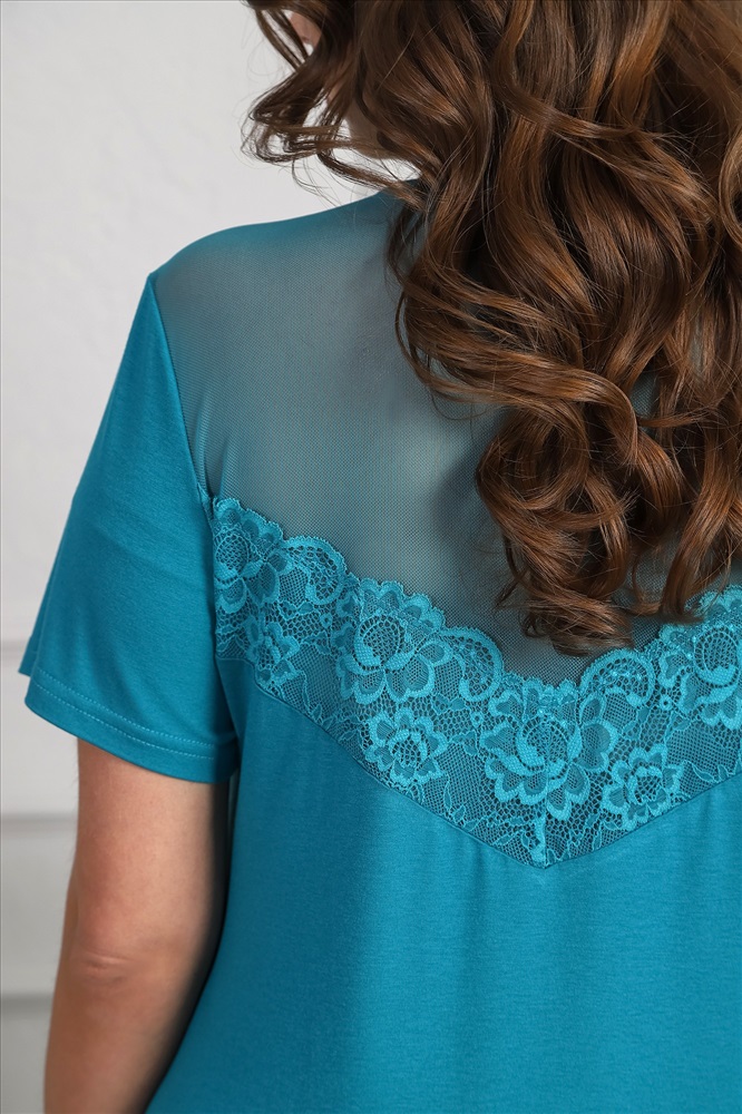Футболка – с короткими втачными рукавами и горловиной овальной формы, окантованной основным материалом. На полочке и спинке – притачные кокетки v-образной формы, выполненные из полотна «сетка», с настроченными на них кружевными.