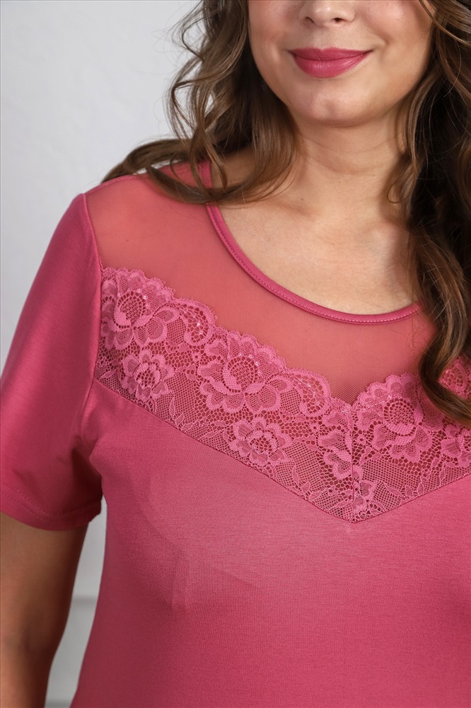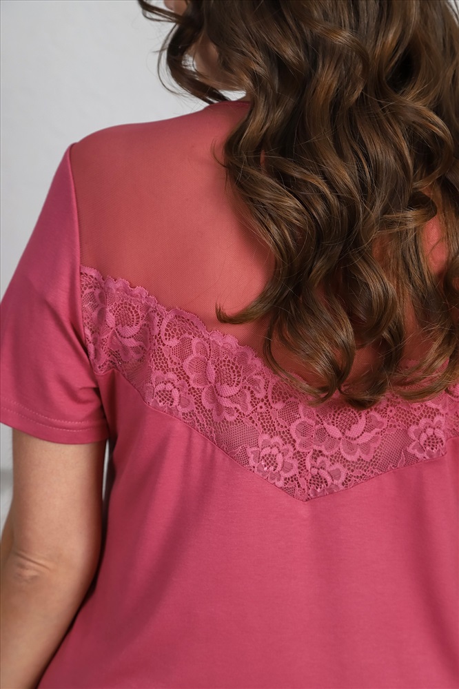 Футболка – с короткими втачными рукавами и горловиной овальной формы, окантованной основным материалом. На полочке и спинке – притачные кокетки v-образной формы, выполненные из полотна «сетка», с настроченными на них кружевными.