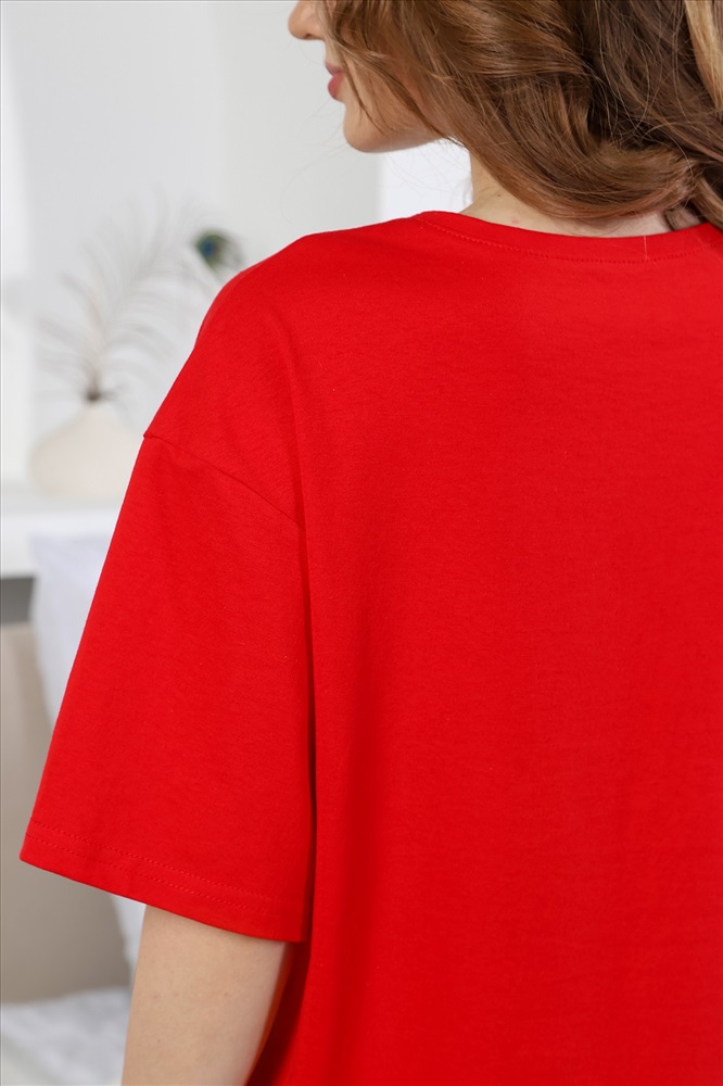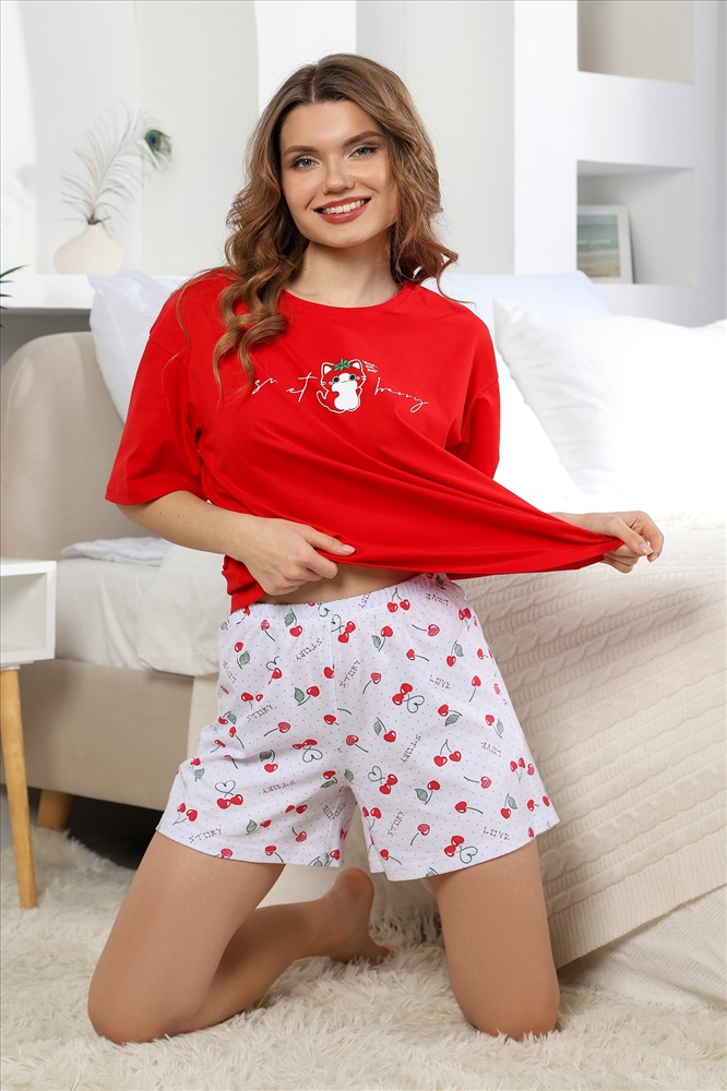 Пижама молодежная из трикотажного полотна «кулирка» в комбинации из двух видов гладкокрашенного и с набивным рисунком, состоящая из футболки и шорт. Футболка – свободного покроя из гладкокрашеного полотна, с короткими втачными рукавами, горловиной овальной формы, обработанной притачной бейкой и принтом на полочке, выполненным в технике «шелкографии».Шорты – из набивного полотна свободного покроя, на притачном поясе с эластичной тесьмой внутри.