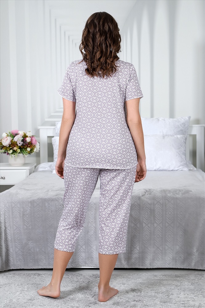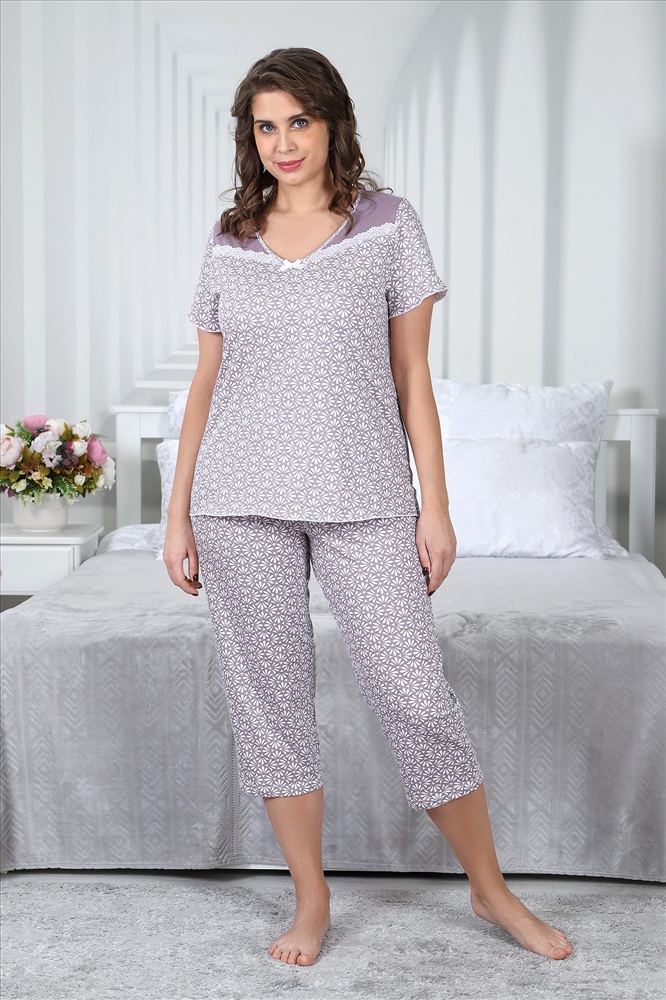 кокеток с основной деталью, в центре горловины декоративный бантик.Бриджи – из набивного полотна свободного покроя, на притачном поясе с эластичной тесьмой
