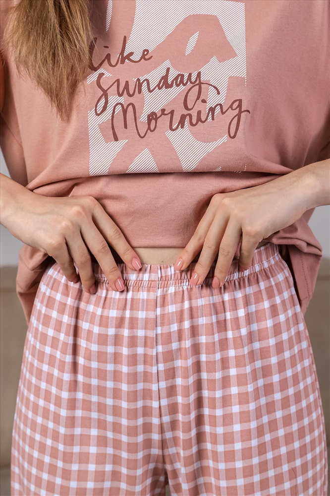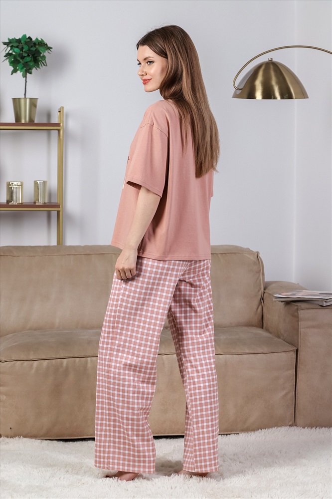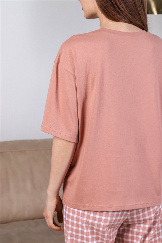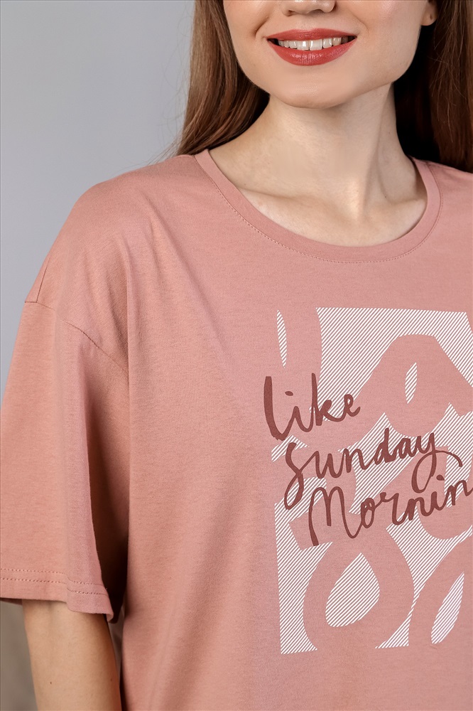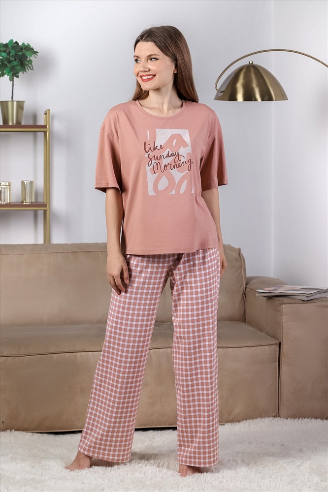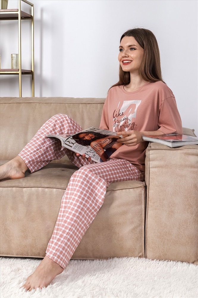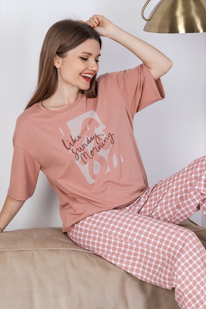 Пижама молодежная из трикотажного полотна «кулирка» в комбинации двух видов: гладкокрашеного и с набивным рисунком, состоящая из футболки и брюк. Футболка – из гладкокрашеного полотна, классического покроя, с короткими втачными рукавами, горловиной овальной формы, обработанной притачной бейкой и принтом на полочке, выполненным в технике «шелкографии».Брюки – из полотна с набивным рисунком, свободные классического покроя, с эластичной тесьмой по талии.