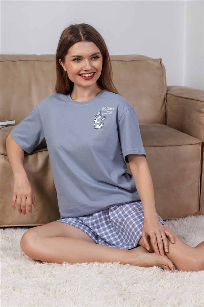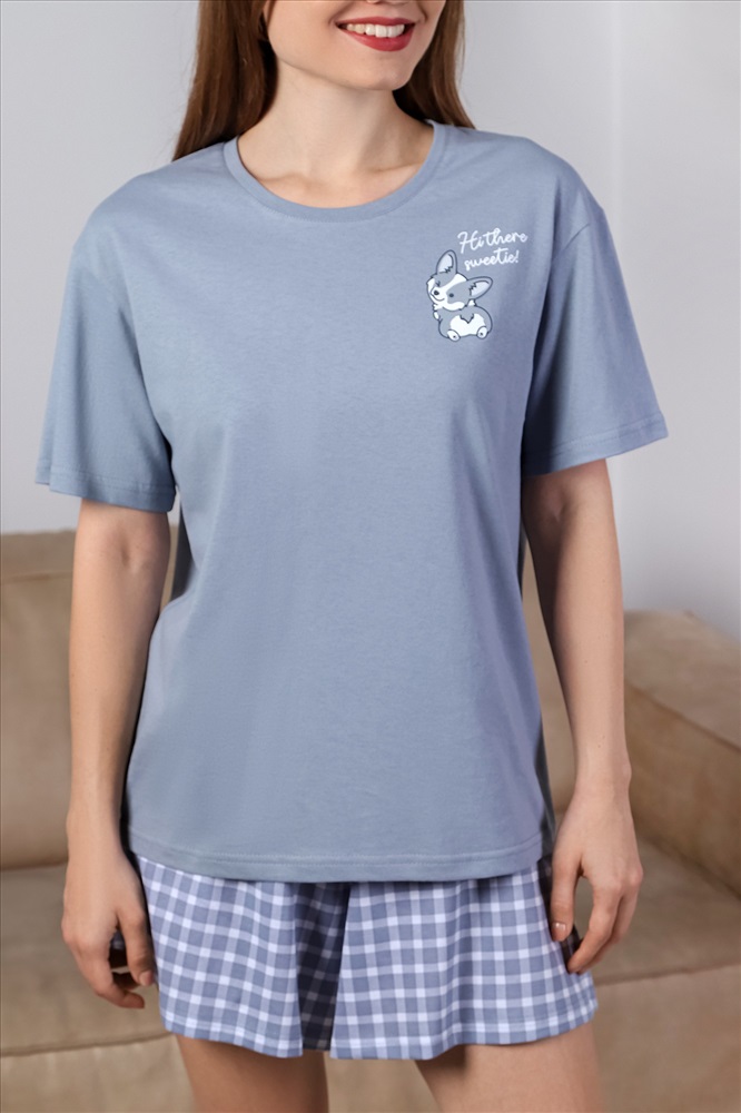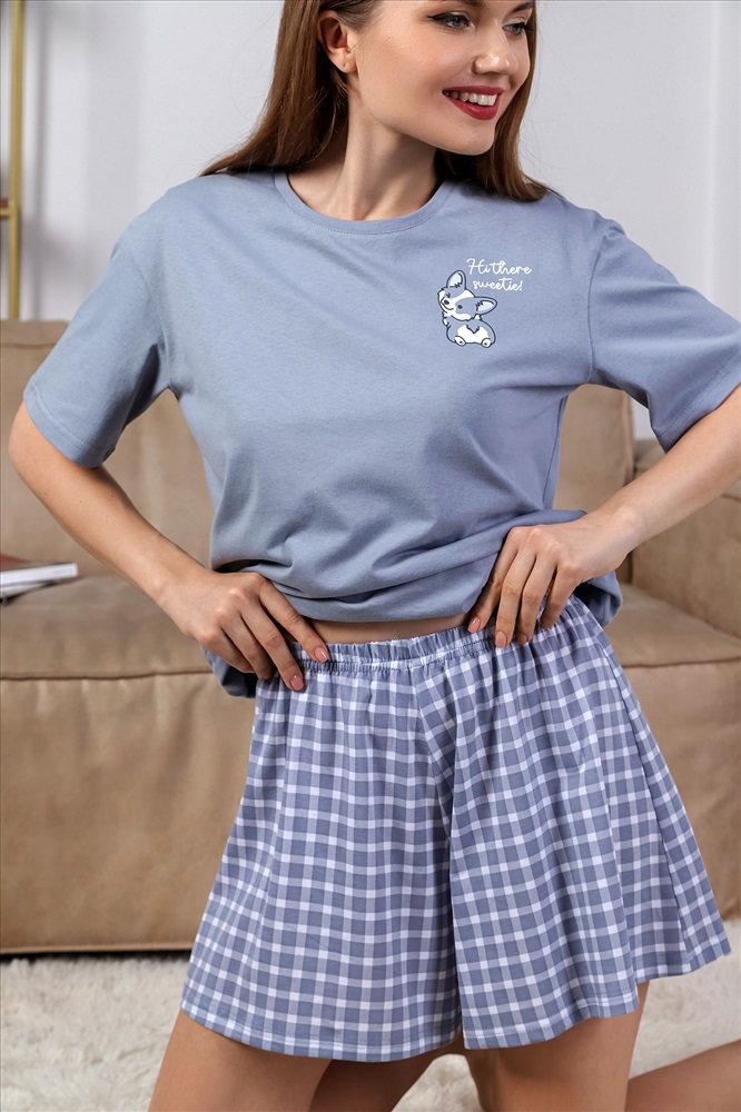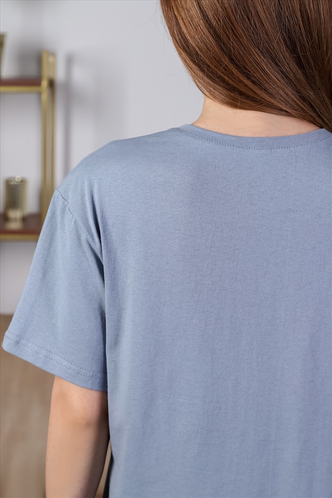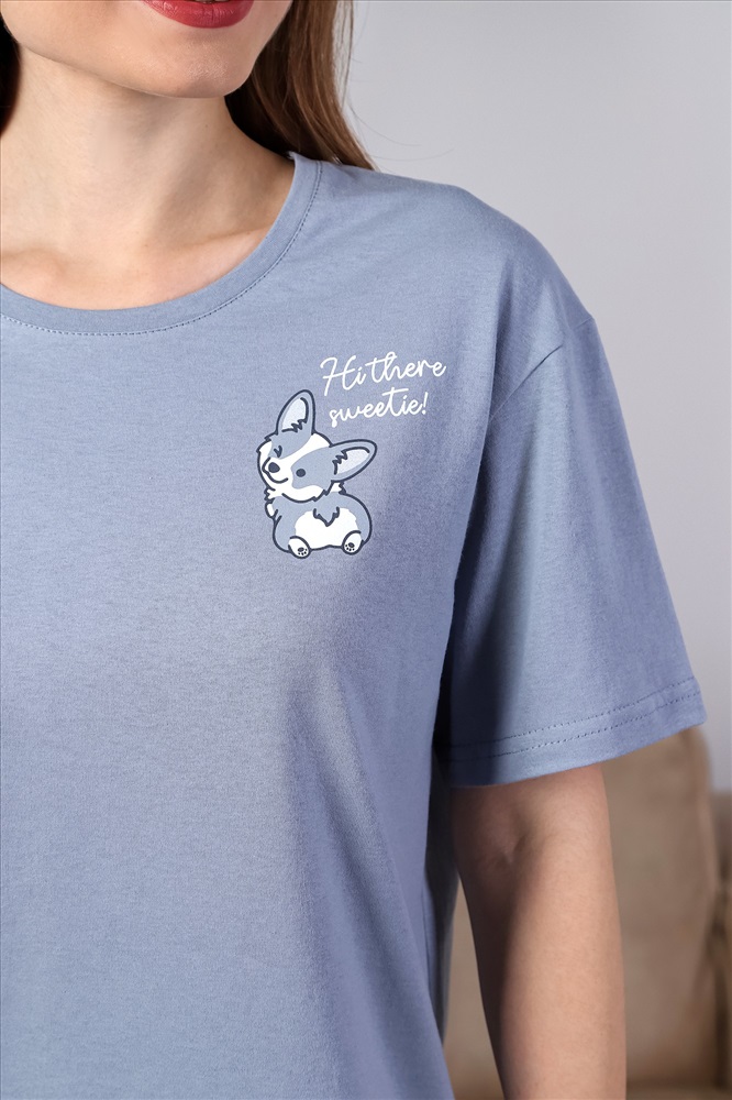 Футболка – свободного покроя из гладкокрашеного полотна, с короткими втачными рукавами, горловиной овальной формы, обработанной притачной бейкой и принтом на полочке, выполненным в технике «шелкографии».Шорты – из набивного полотна свободного покроя, на притачном поясе с эластичной тесьмой внутри.