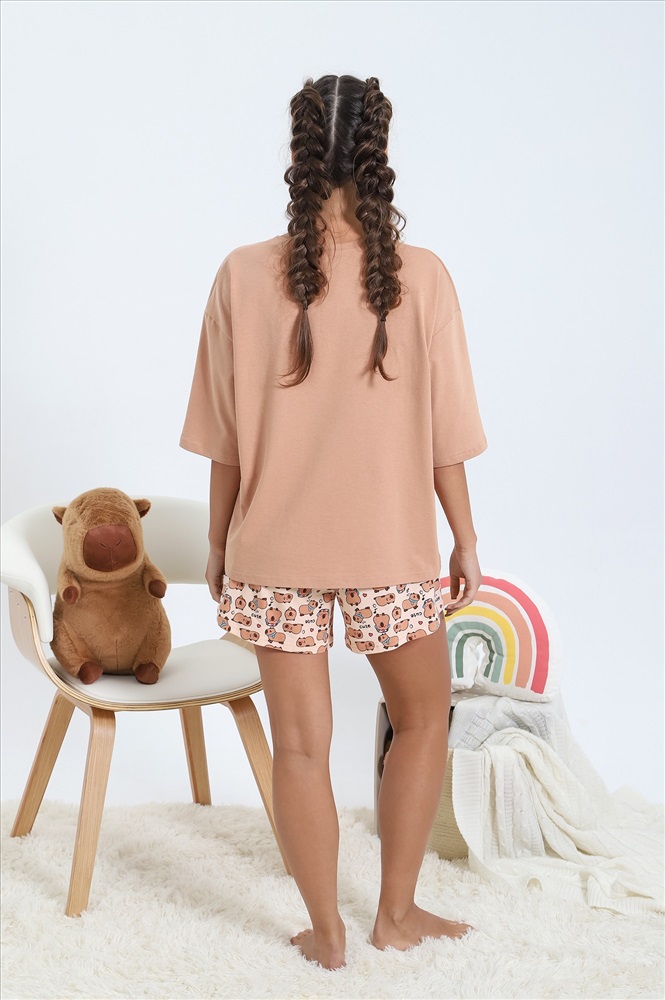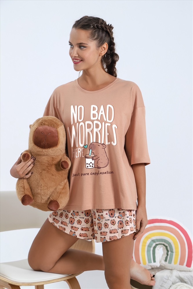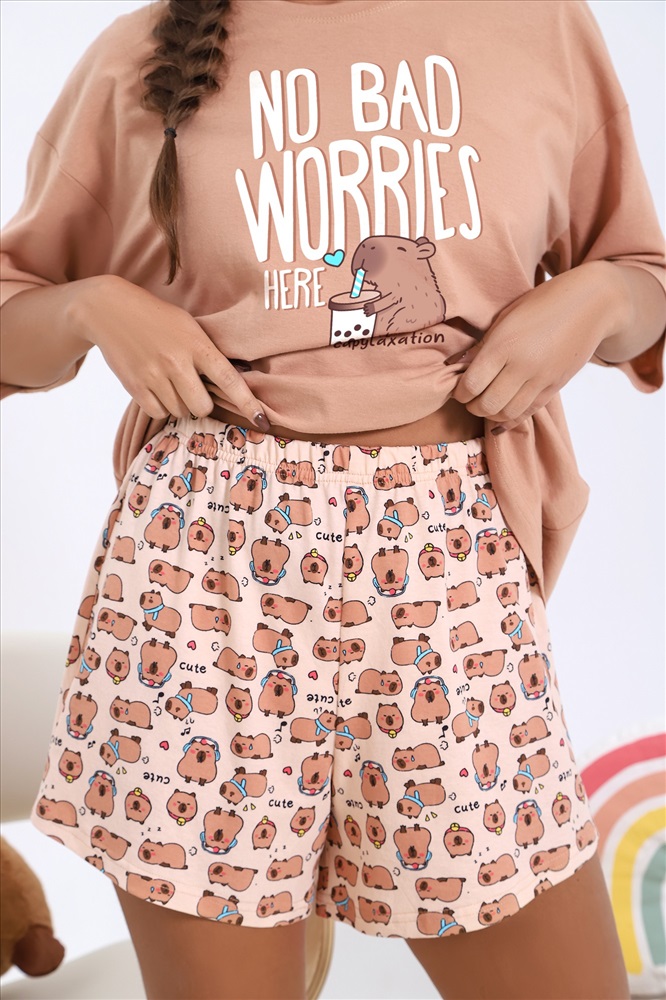 Пижама женская, состоящая из футболки и шорт. Футболка - из гладкокрашеного полотна , свободного покроя, укороченная, с коротким втачными рукавами и горловиной овальной формы, обработанной втачной бейкой. Нижние срезы рукавов и изделия обработаны швом вподгибку. По шву втачивания планки в горловину настрочена отделочная строчка. На детали переда - принт, выполненный методом шелкографии. Шорты - из полотна с набивным рисунком, средней длины, свободного покроя, с нижними срезами фигурной формы. Верхний срез обработан швом вподгибку с эластичной тесьмой, нижние - швом вподгибку.