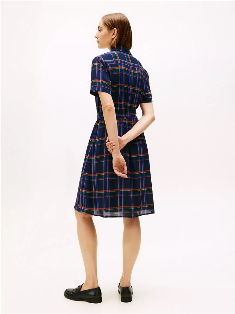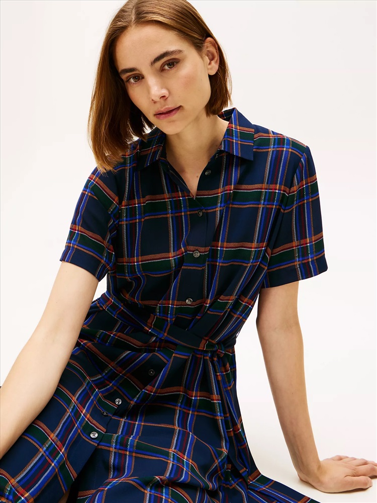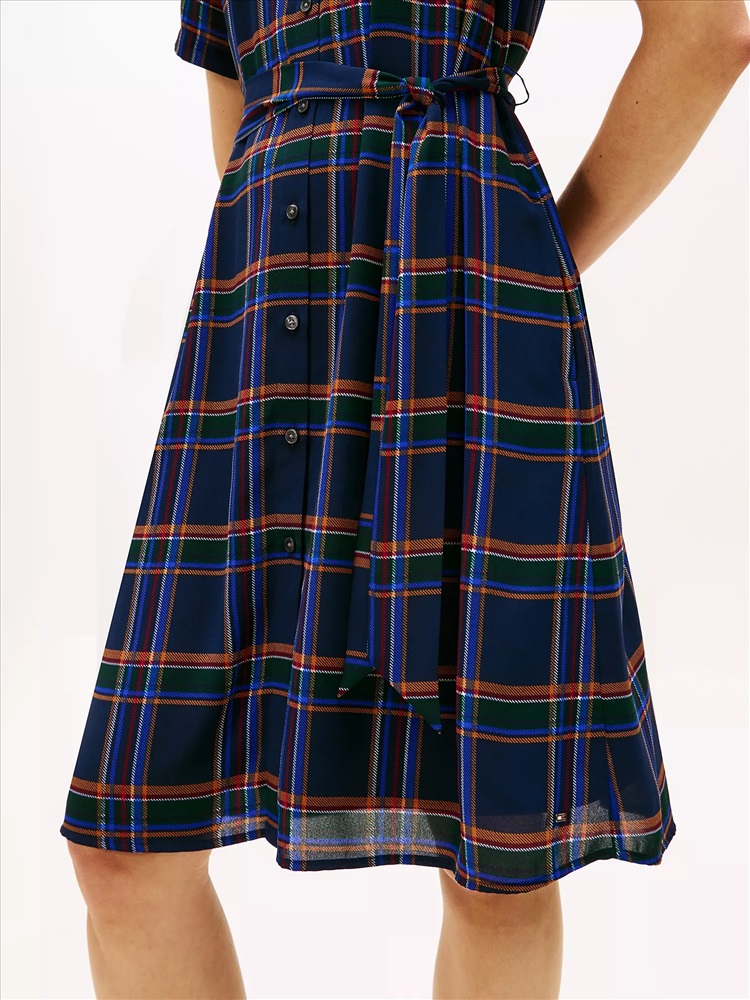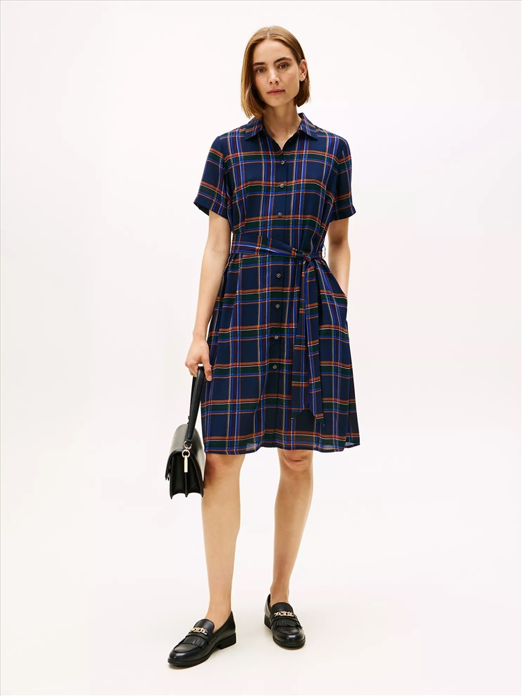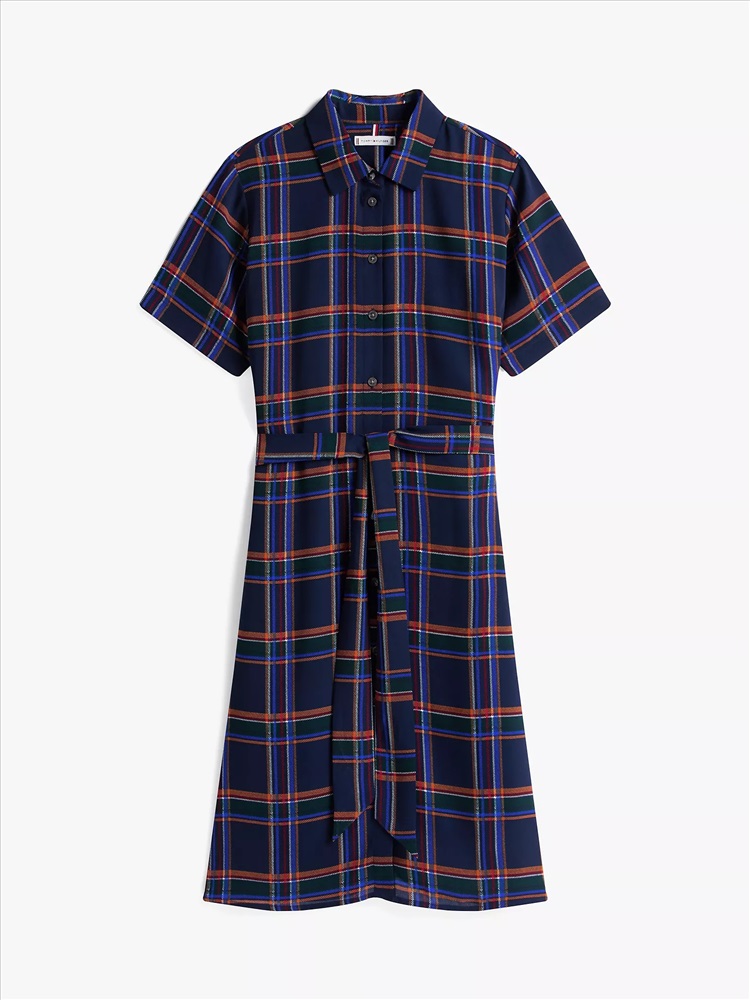 Tommy Hilfiger women's dress. Made from lightweight georgette known for its excellent drape, our plaid shirtdress features a self-tie belt, slip lining and handy side pockets.