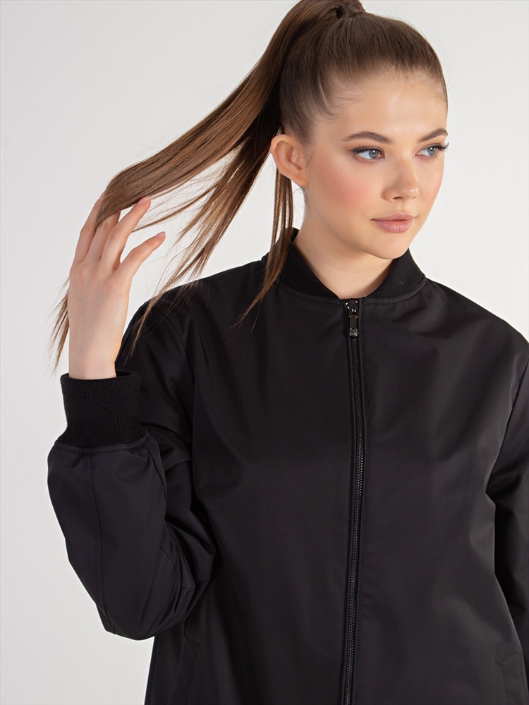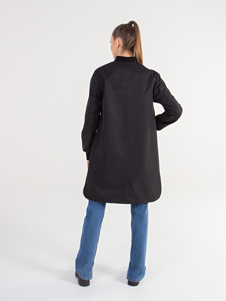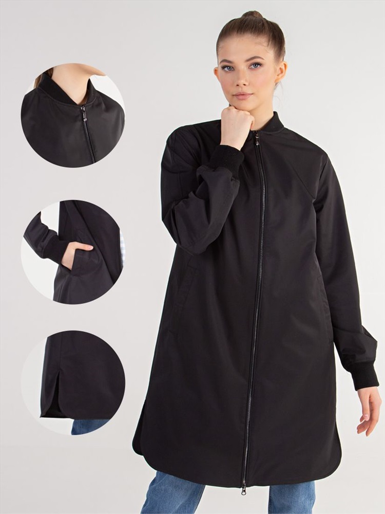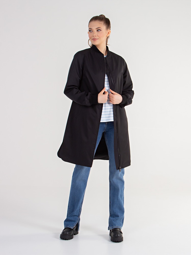Длина: 90 см Трикотажный воротник- стойка,  вязанные манжеты и металлический центральный замок - все элементы «бомбера» воплотили в легком весеннем плаще . Боковые разрезы по бокам закруглённые, удобные прорезные карманы. Ткань с легкой  водоотталкивающей пропиткой.На модели надет 42 размер,рост модели 172 см.