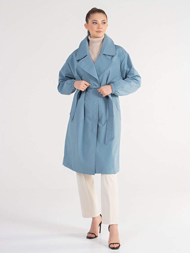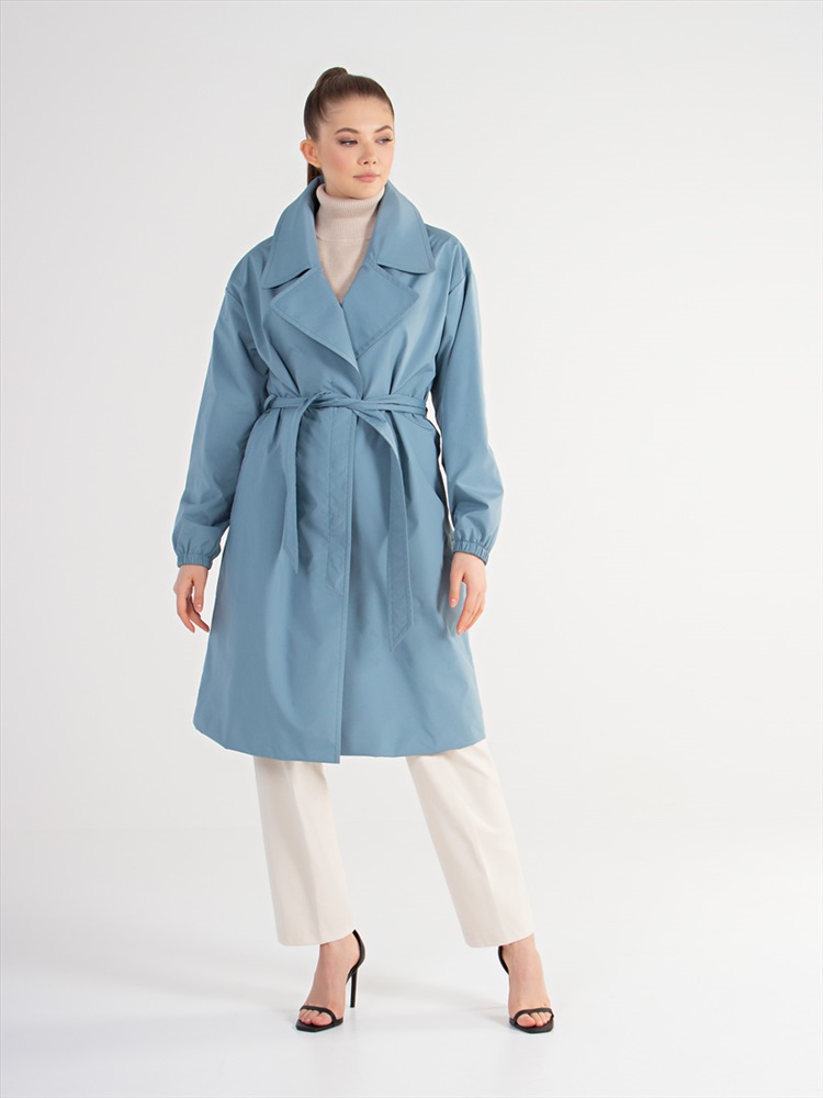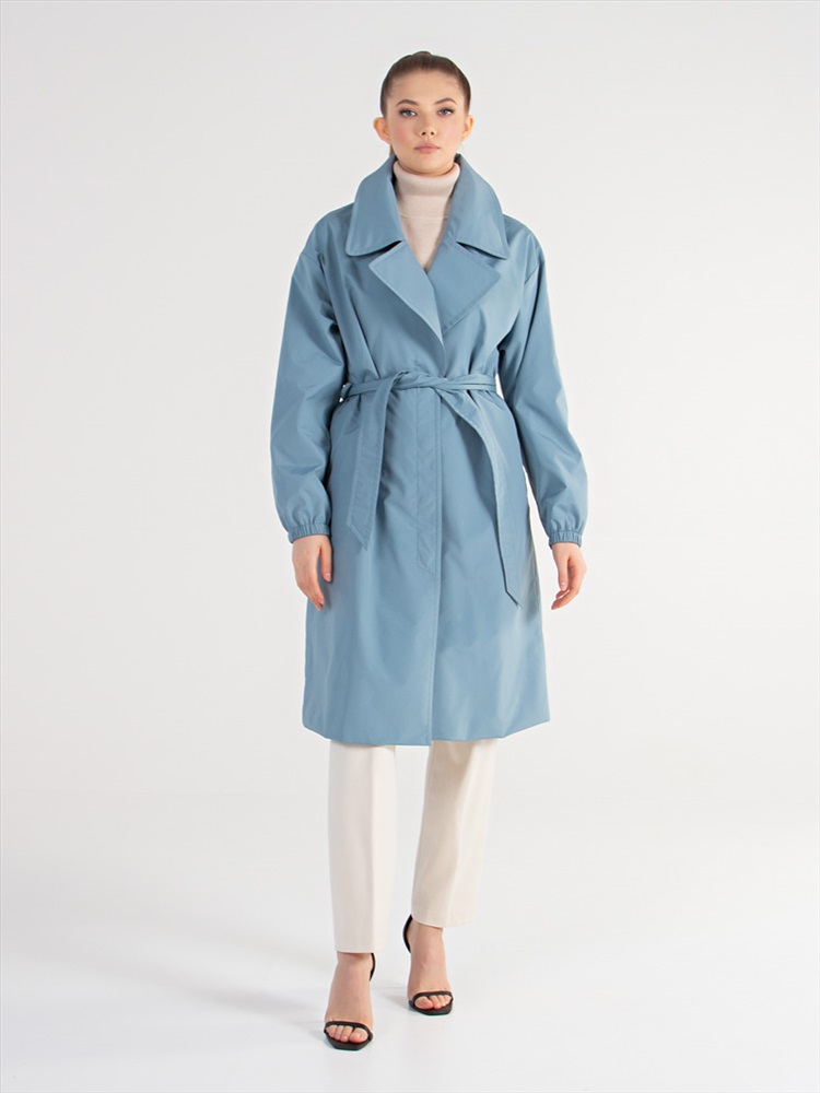 Длина: 103 см Современный плащ прямого силуэта с поясом. Английский воротник на стойке и застежка на потайные кнопки. Удобные прорезные карманы в боковых швах. Втачной тип рукава, по низу которого- резинка. Деликатная шаговая шлица, шлёвки на спинке.