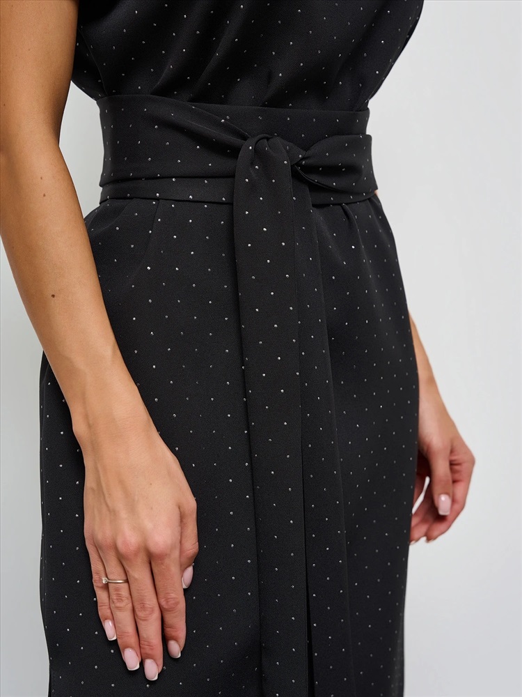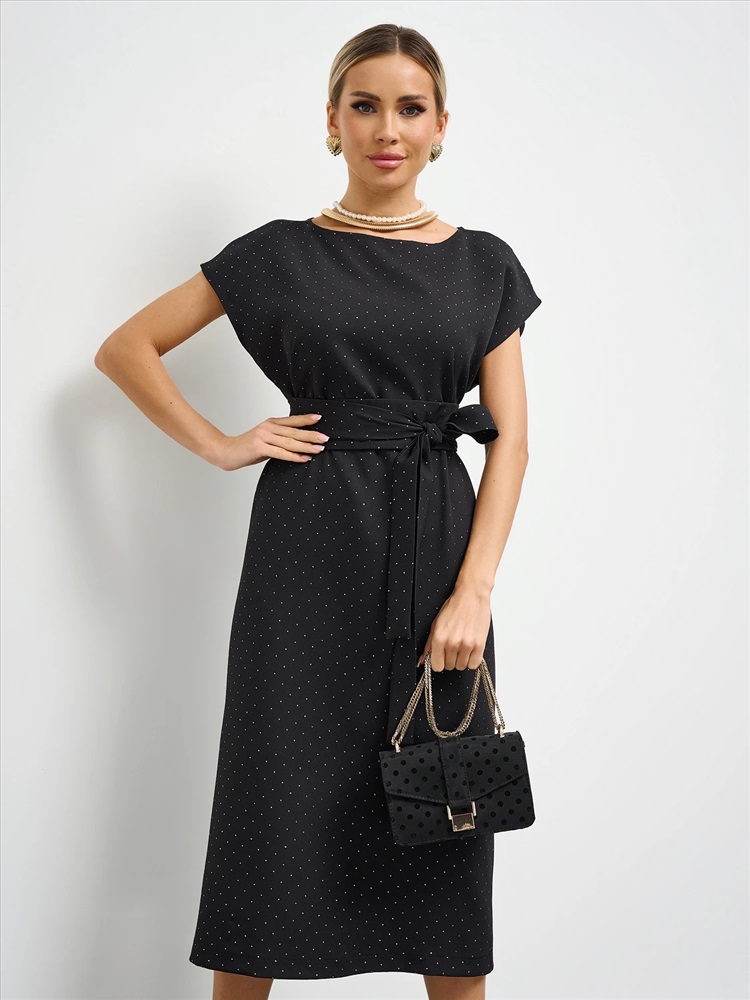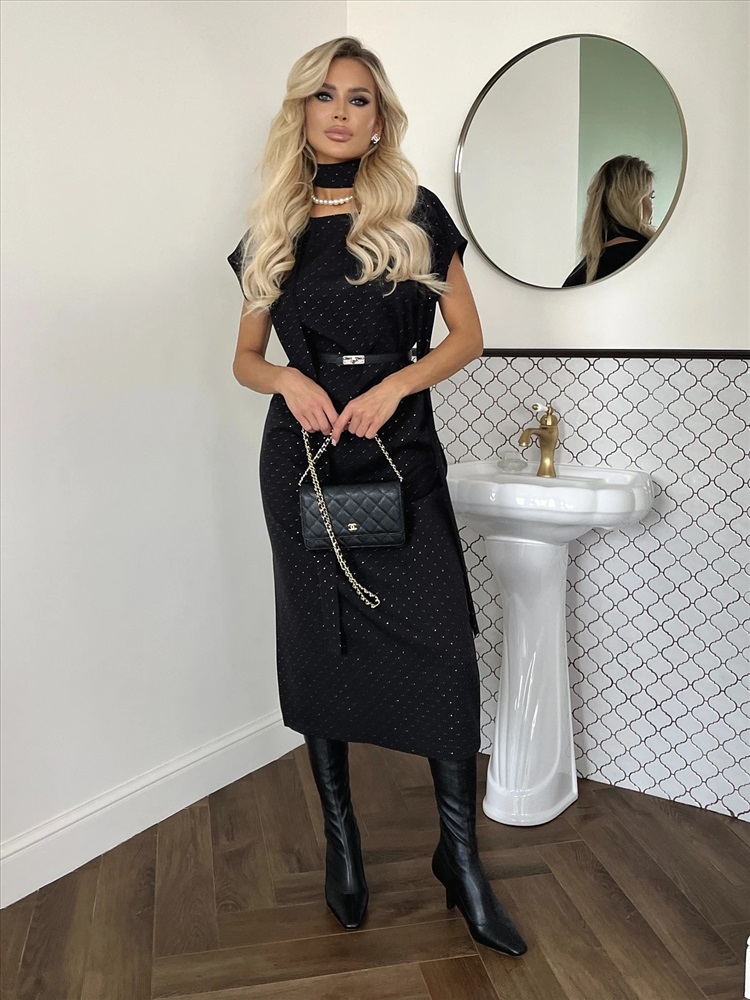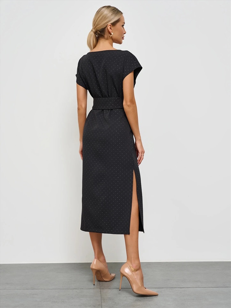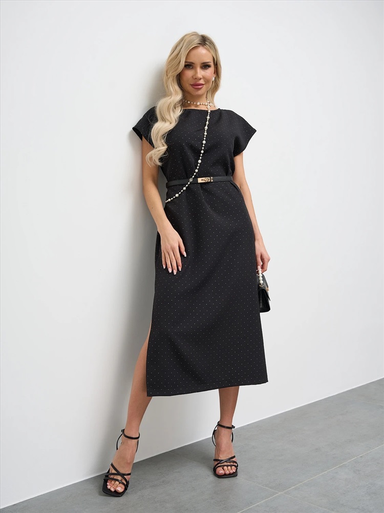 Платье выполнено из костюмной ткани с серебристым декором, который создает эффект торжественности и роскоши. Вырез горловины – «лодочка». Короткий цельнокроеный рукав. В боковом шве с одной стороны разрез. Пояс из основной ткани в комплекте. Пояс из кожи не идет в комплекте, представлен только для создания образа. Комментарии к товару