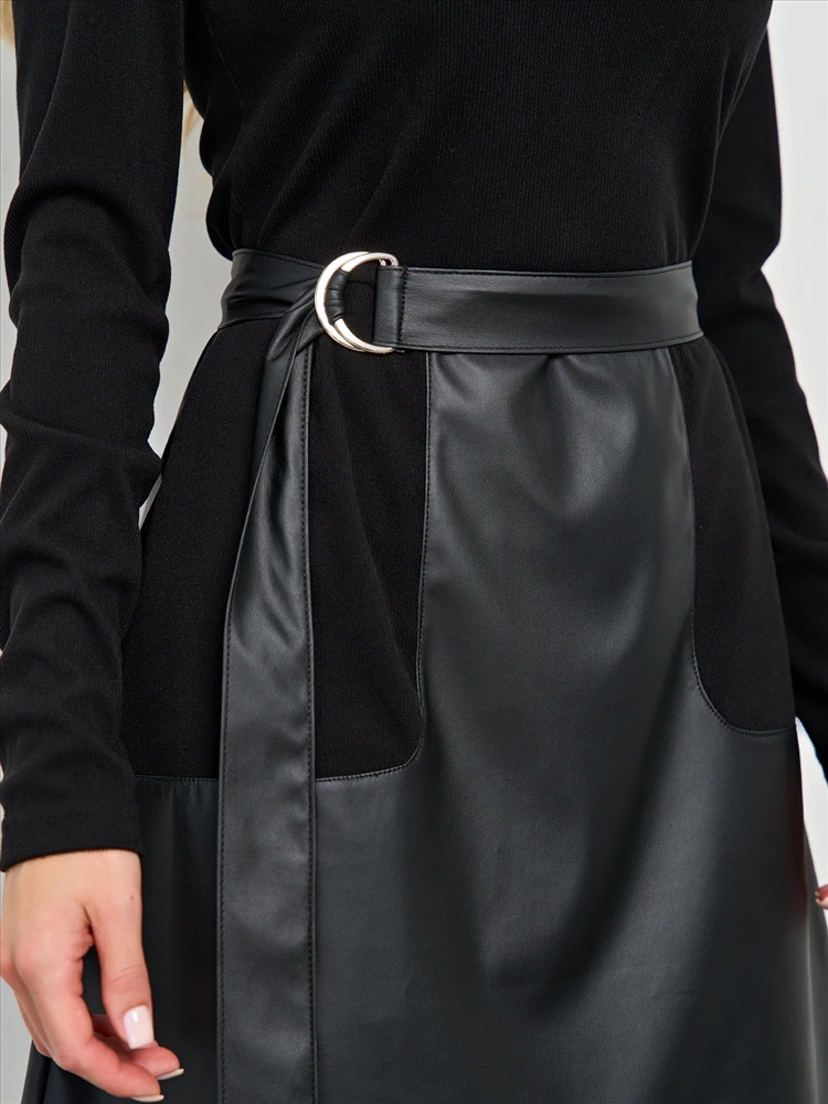 Верх из плотного трикотажа лапша. Длинные втачные рукава. Отрезное платье по линии талии. Низ выполнен из искусственной кожи комбинированной с трикотажем. Платье декорировано поясом из искусственной кожи с пряжкой-полукольцом. Комментарии к товару