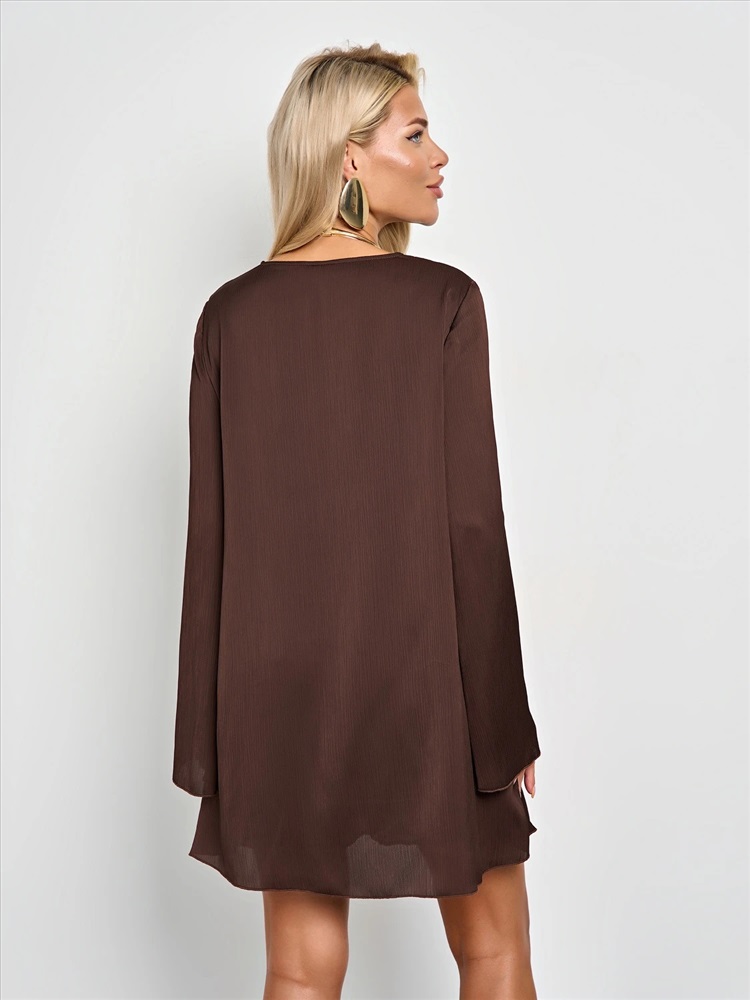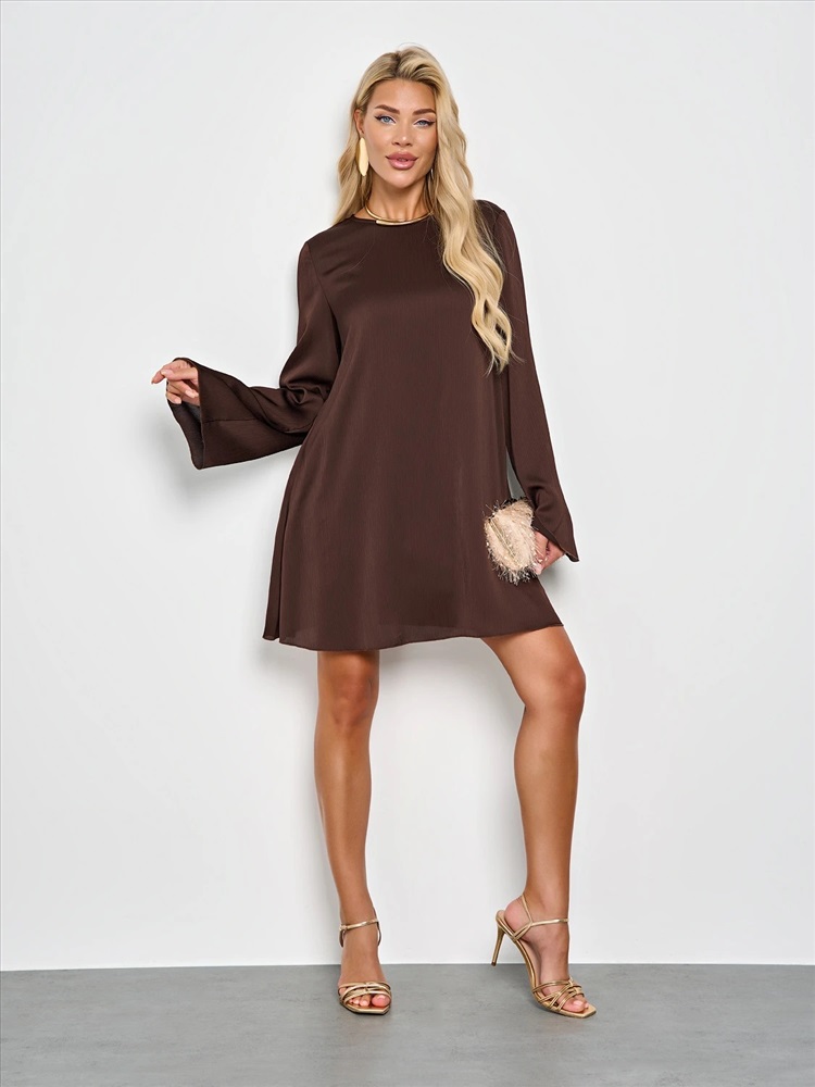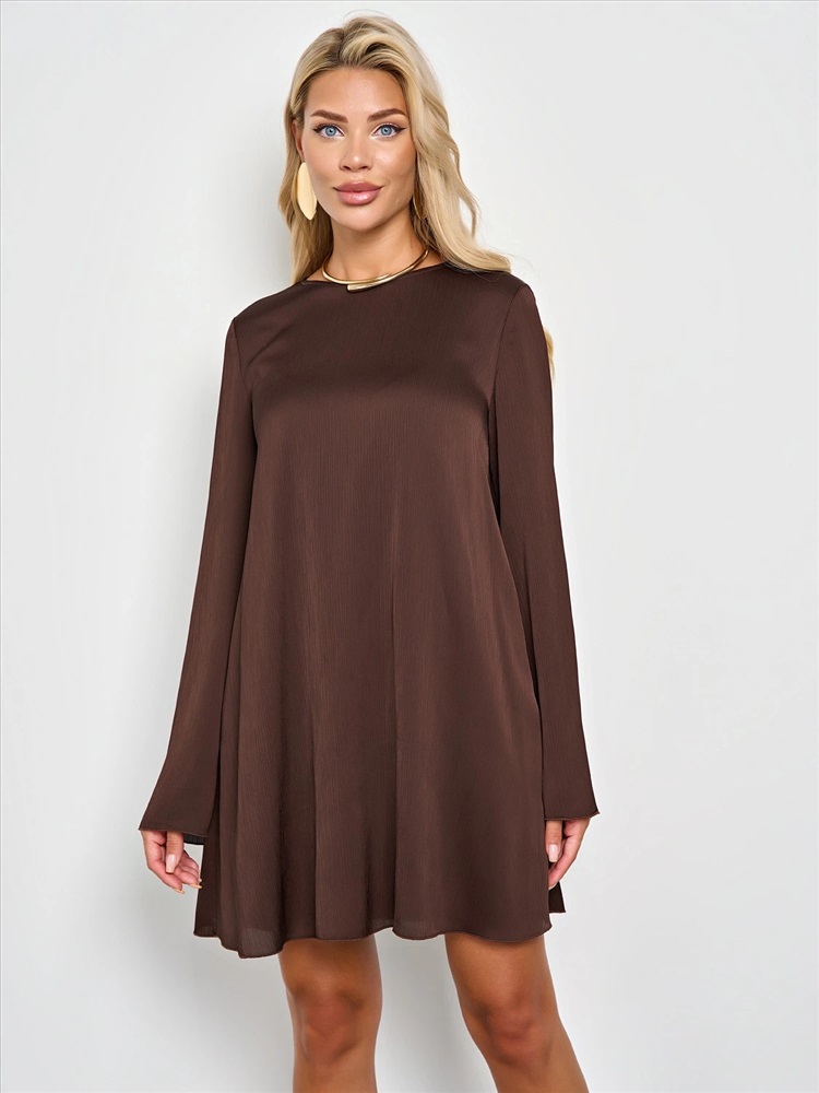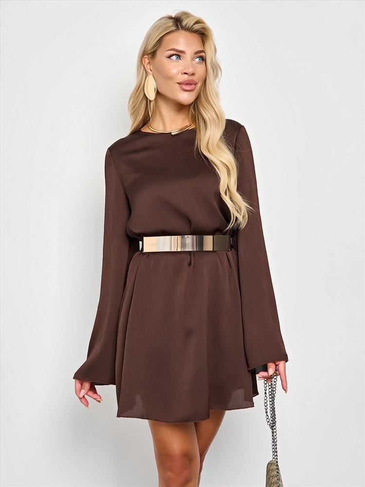 Круглый вырез горловины. Изделие прилегающее по груди и расклешенное в нижней части. Длинные втачные рукава. Ремень не идет в комплекте. замер от 31.07 Комментарии к товару