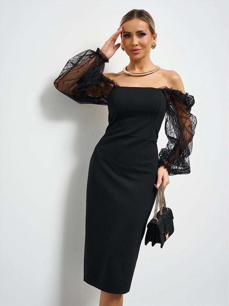 Платье из трикотажа, отрезное по линии талии, с рельефным верхом. Рукава выполнены из сетки с рисунком.
