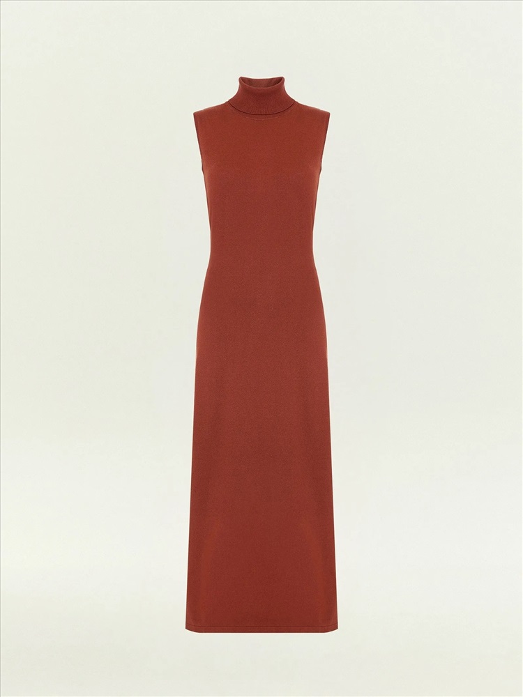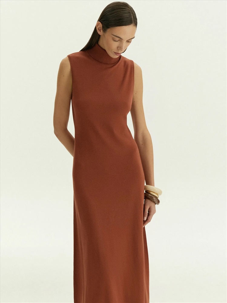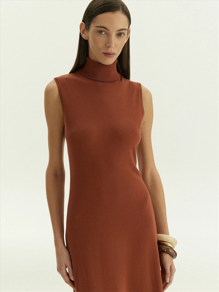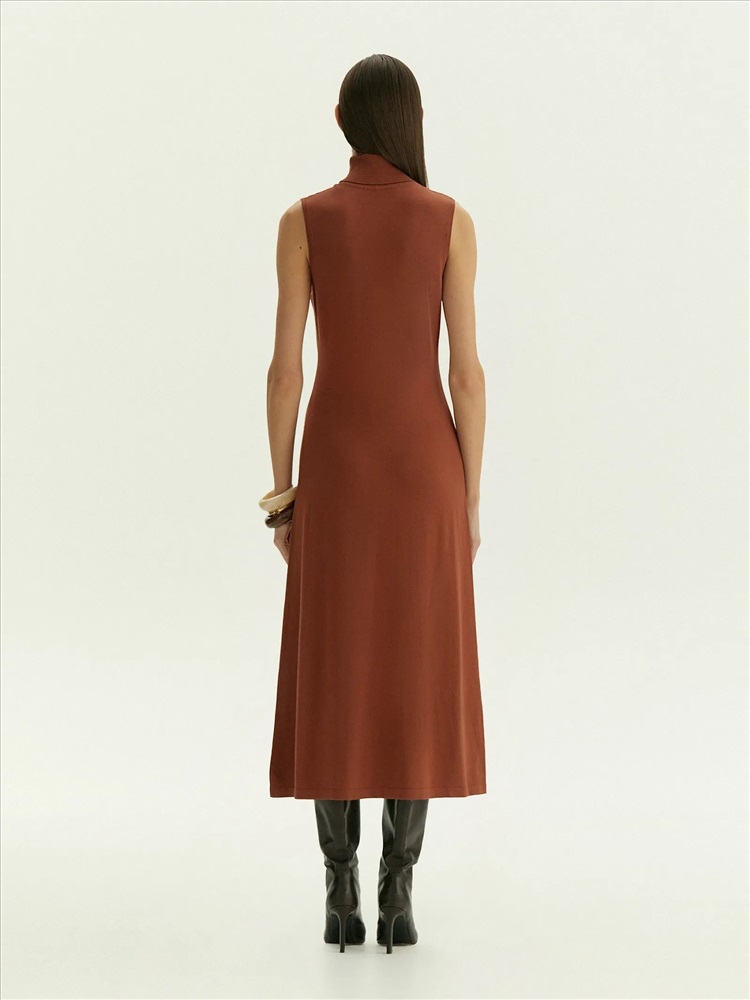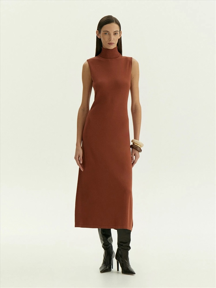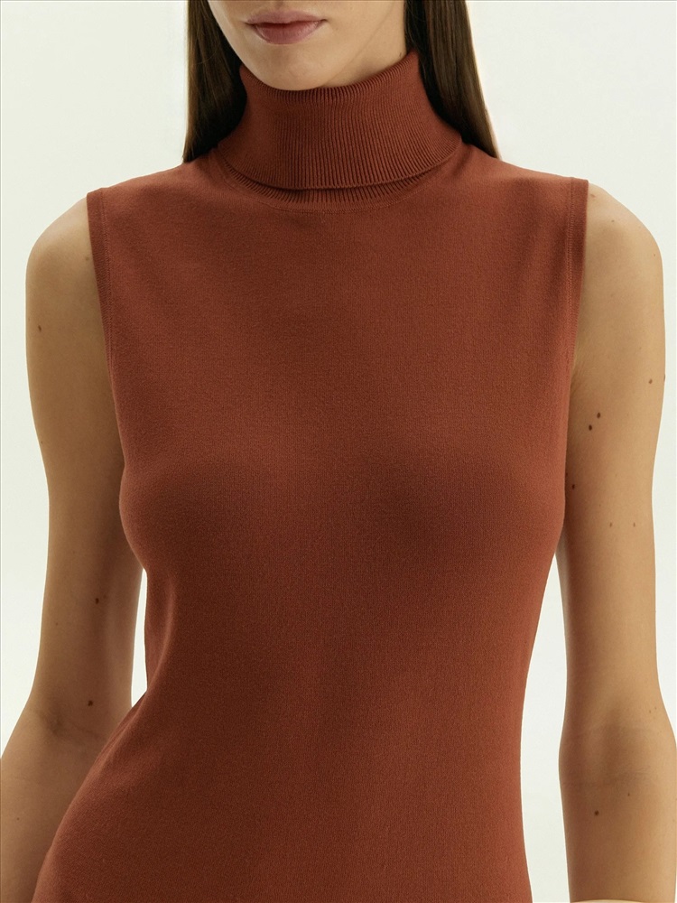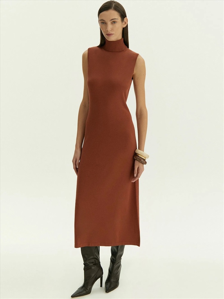 Незаменимая вещь для базового гардероба к межсезонью и зиме — вязаное платье мидакси без рукавов и с высоким горлом. Ворот защищает горло, а удобные глубокие проймы идеальны для образов с жакетами, кардиганами и верхней одеждой. Приталенная модель красиво садится по фигуре, воротник изящно охватывает шею. Мягкий материал тонкой вязки сделан на основе комфортной к телу вискозы. Терракотовый цвет поддерживает тренды сезона в образах и создаёт ощущение тепла. Платье универсально и имеет широкую сочетаемость. Подходит на каждый день и для особых случаев.