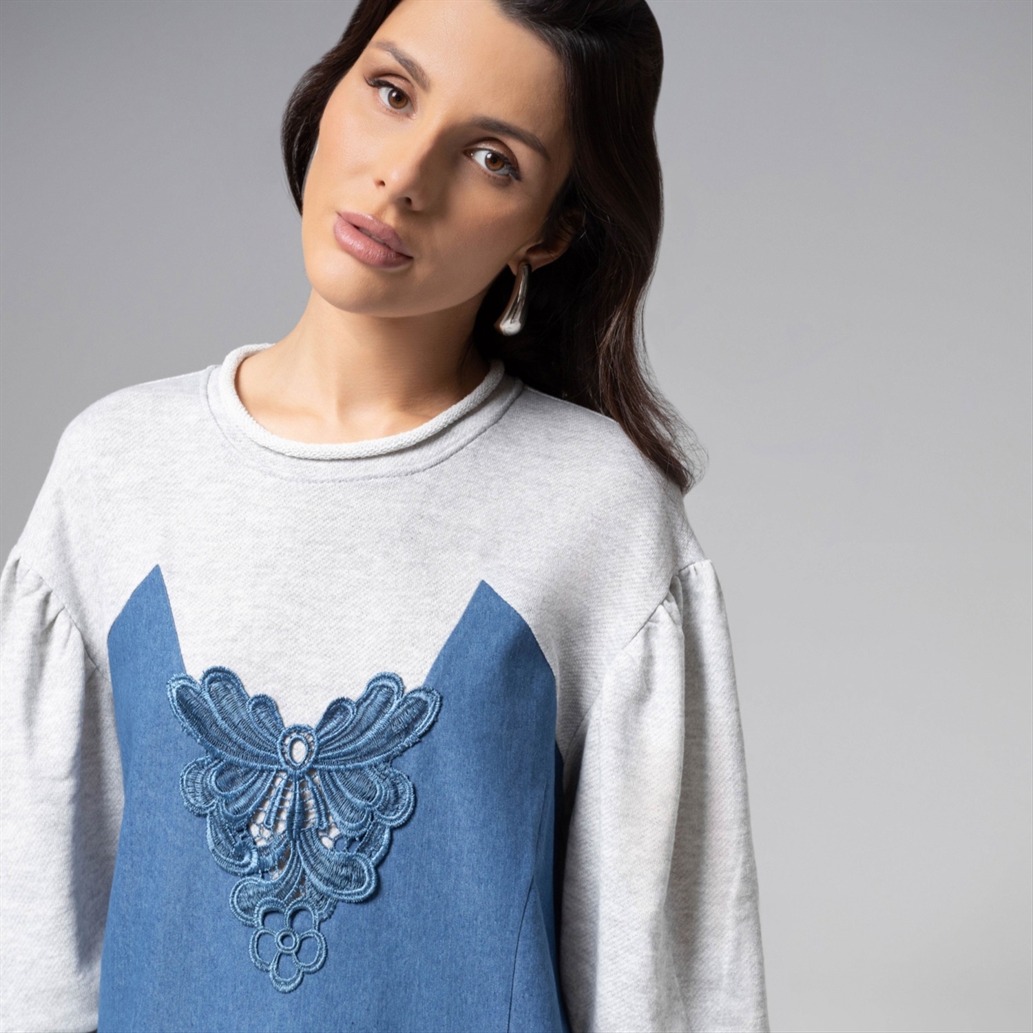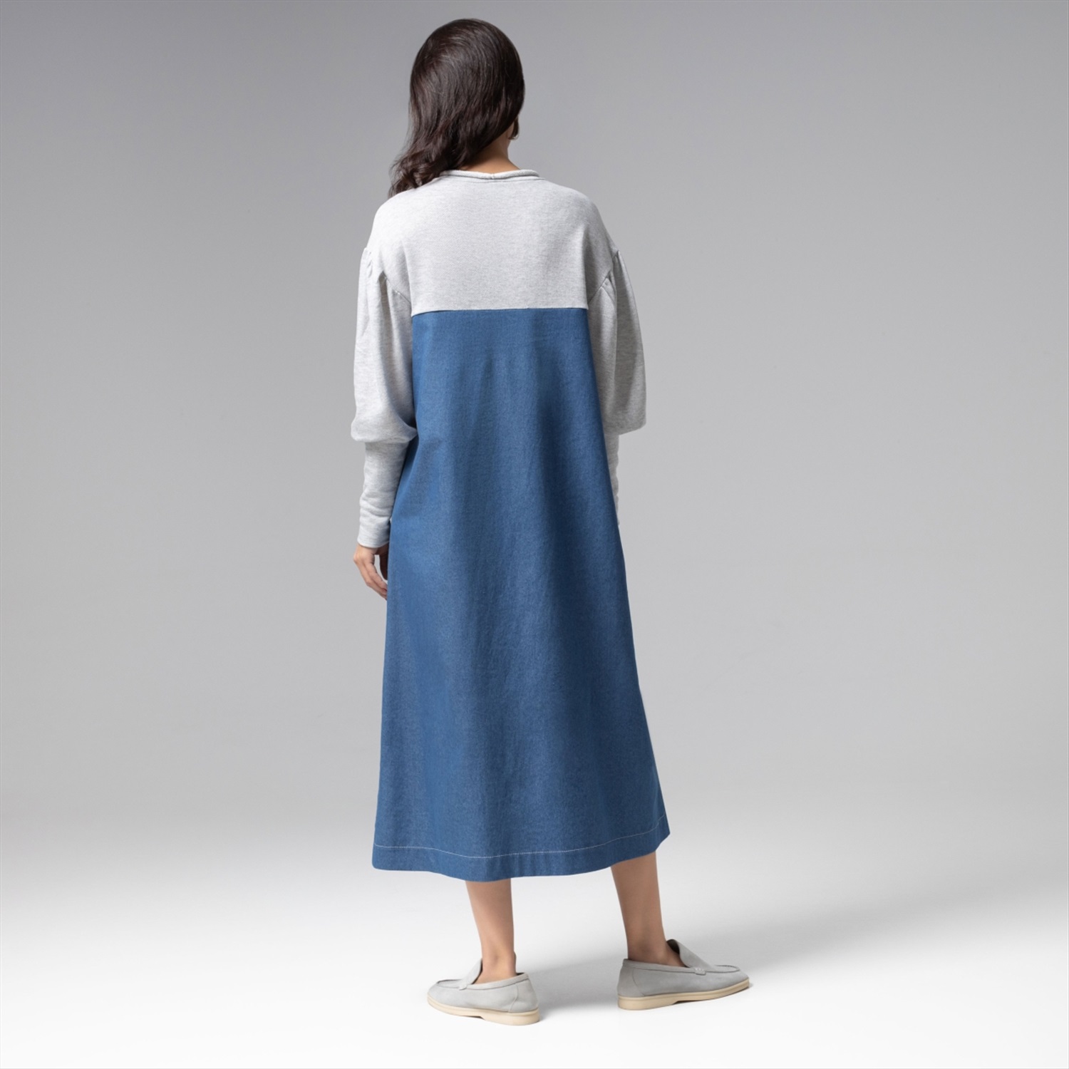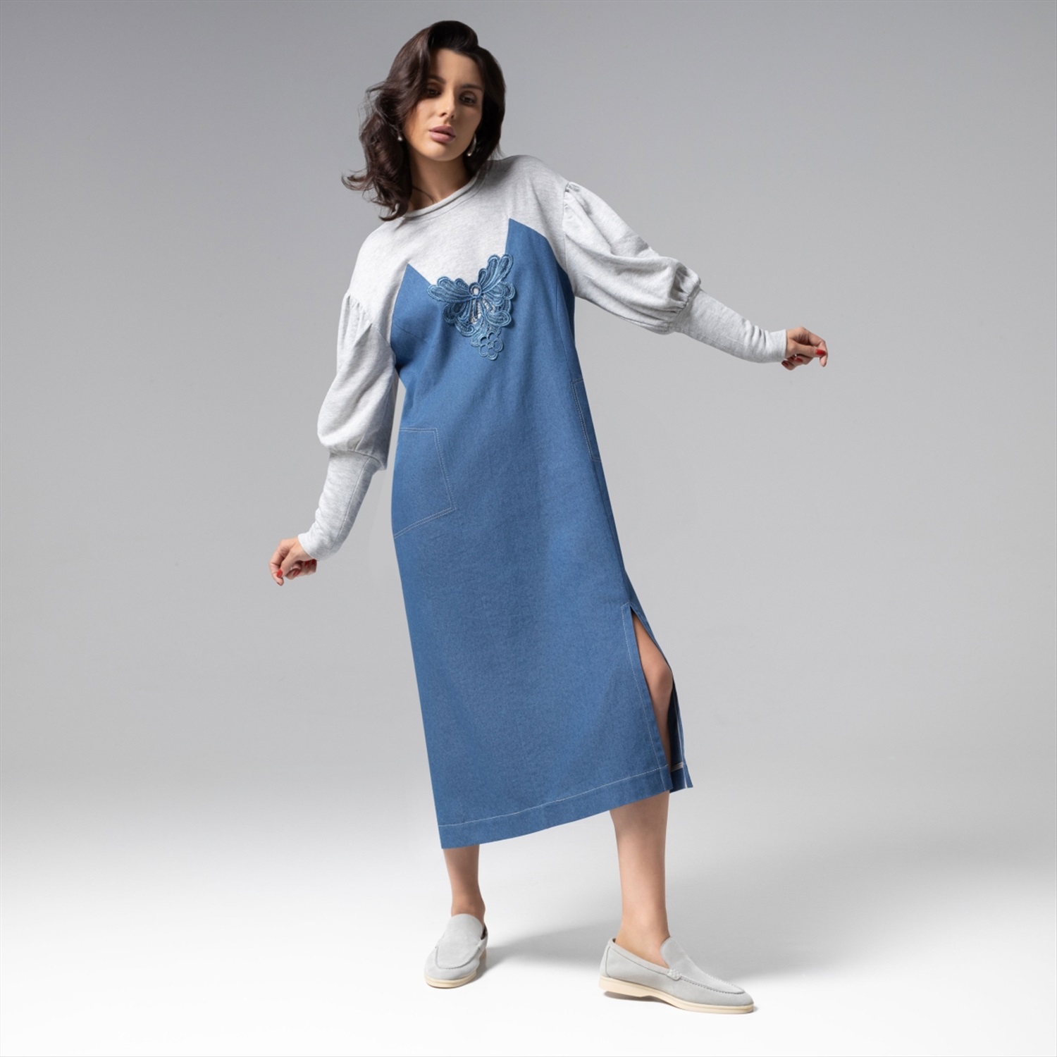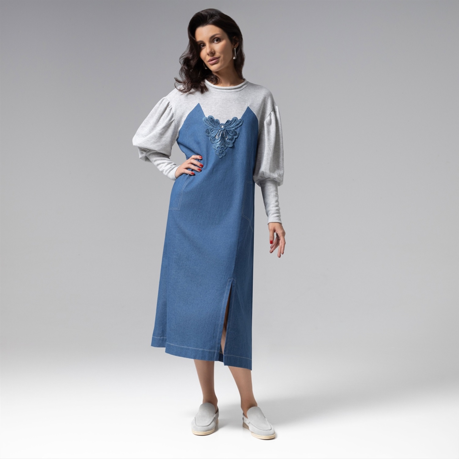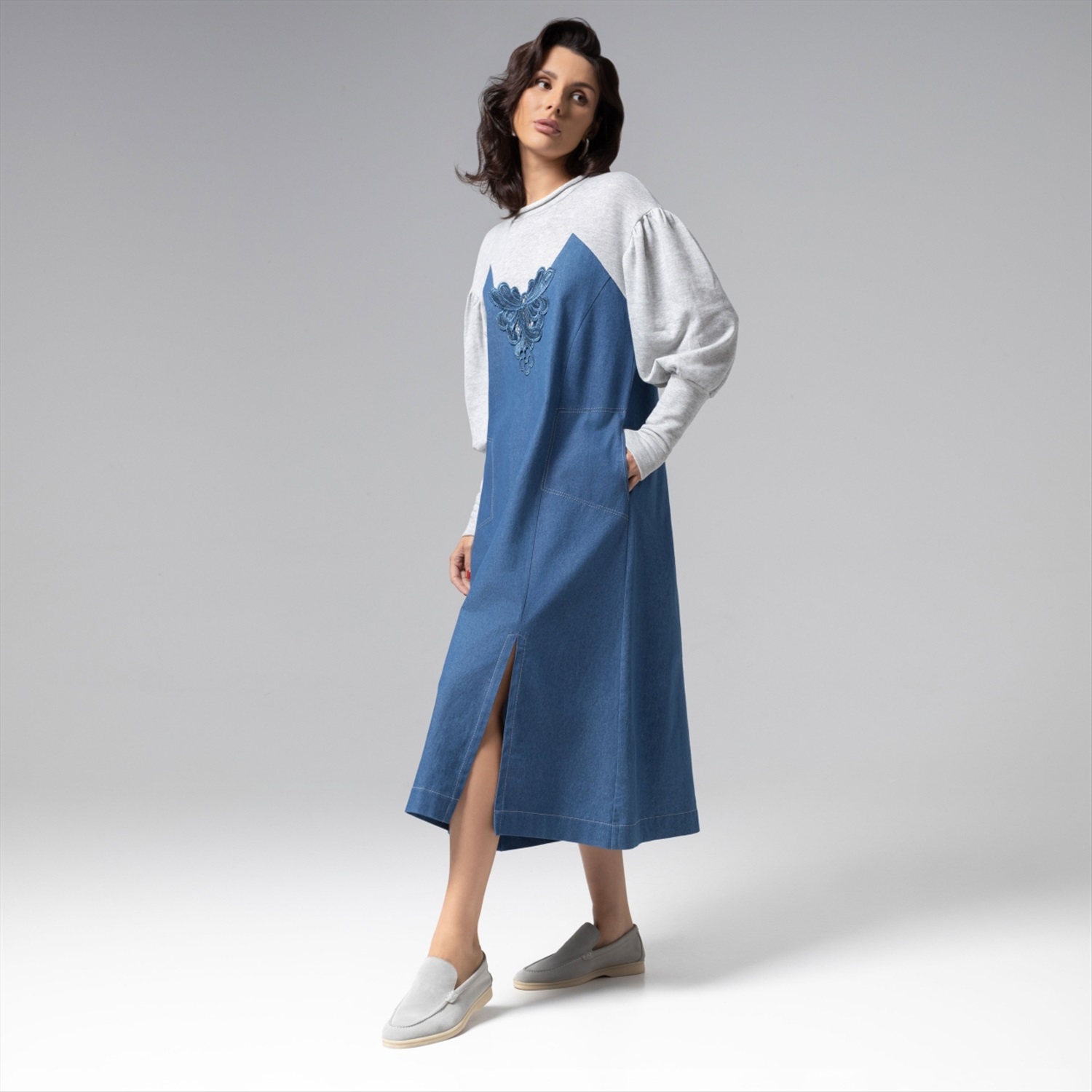 Состав: Костюмная ткань «джинс», трикотаж «футер» (65% хлопок, 30% п/э, 5% спандекс) Плотность ткани: Плотная Тип ткани: Текстиль Вид застежки: Нет Дополнительный цвет ткани: Серый Карманы: В боковом шве Основной цвет ткани: Синий Отрезная талия: Нет Подклад: Нет Резинка по талии: Нет Рисунок/раппорт: Нет, все изделия идентичны Сезон: Круглогодичный Силуэт: Свободный Стиль: Повседневный Параметры модели на фото: