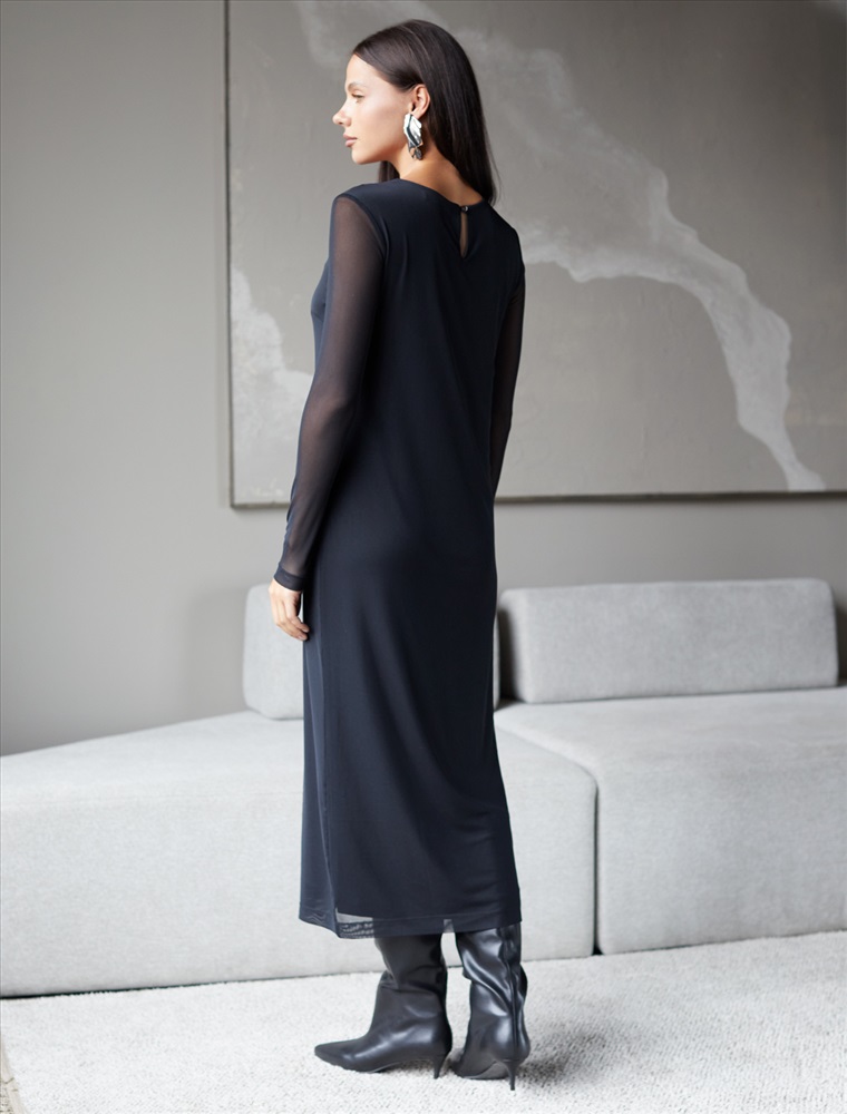 Элегантное платье прямого кроя черного цвета выполнено из воздушной сетчатой ткани с прозрачными рукавами, придающими образу лёгкую игривость. Мягкая вискозная подкладка обеспечивает комфорт, сохраняя при этом эффект полупрозрачности. Универсальный черный цвет делает платье идеальным для базового гардероба.