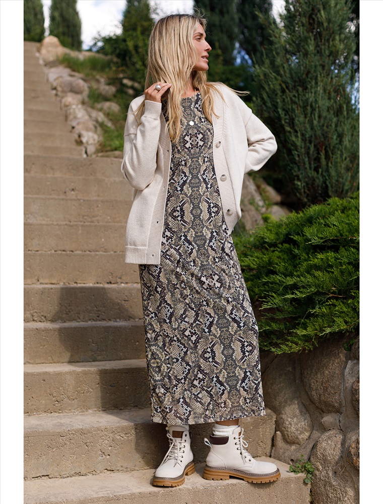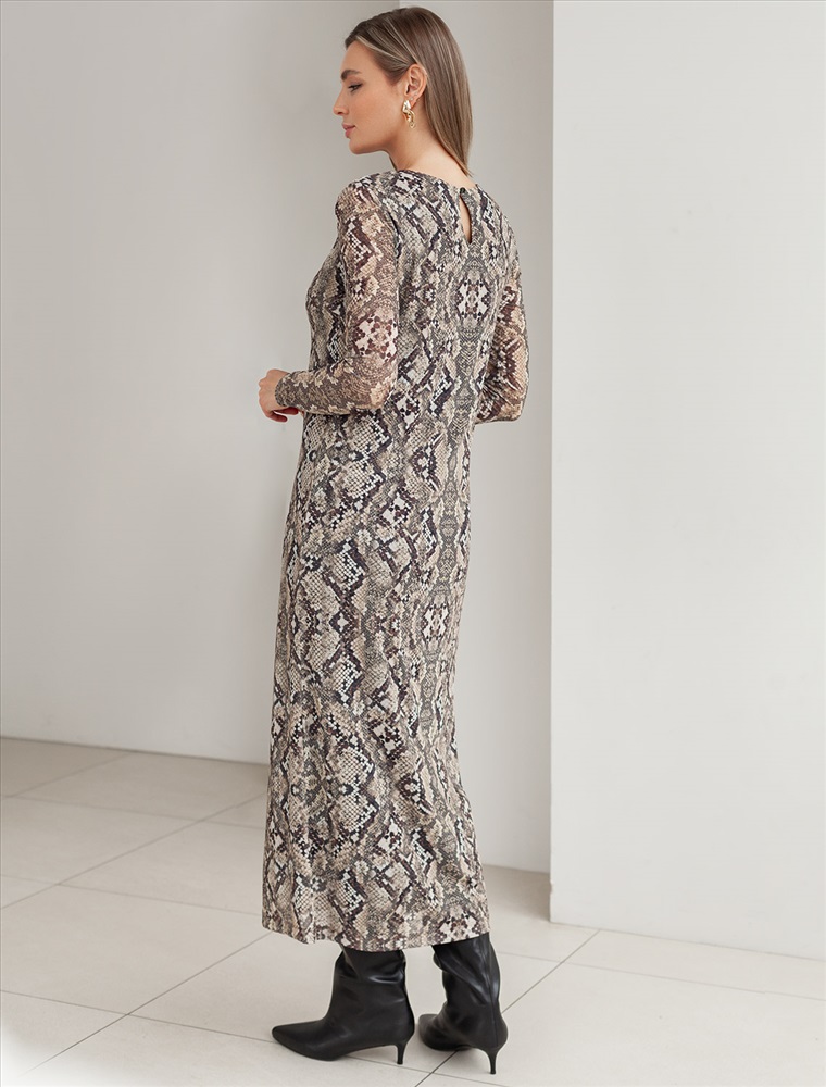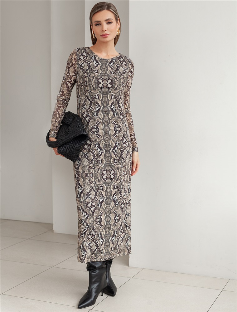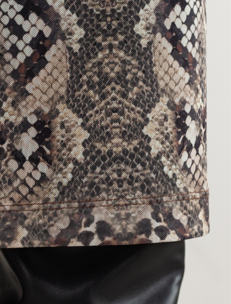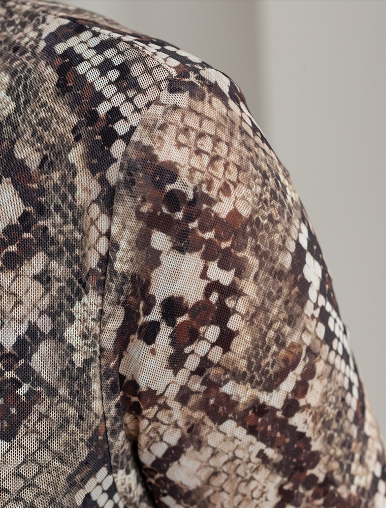 Трендовая модель с эффектным змеиным принтом в коричнево-бежевой гамме. Прямой крой из мягкой сетки на вискозной подкладке создает изящный силуэт. Игра полупрозрачной ткани и подклада добавляет глубину образу. Идеально для вечерних образов с золотистыми аксессуарами.