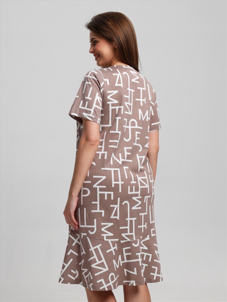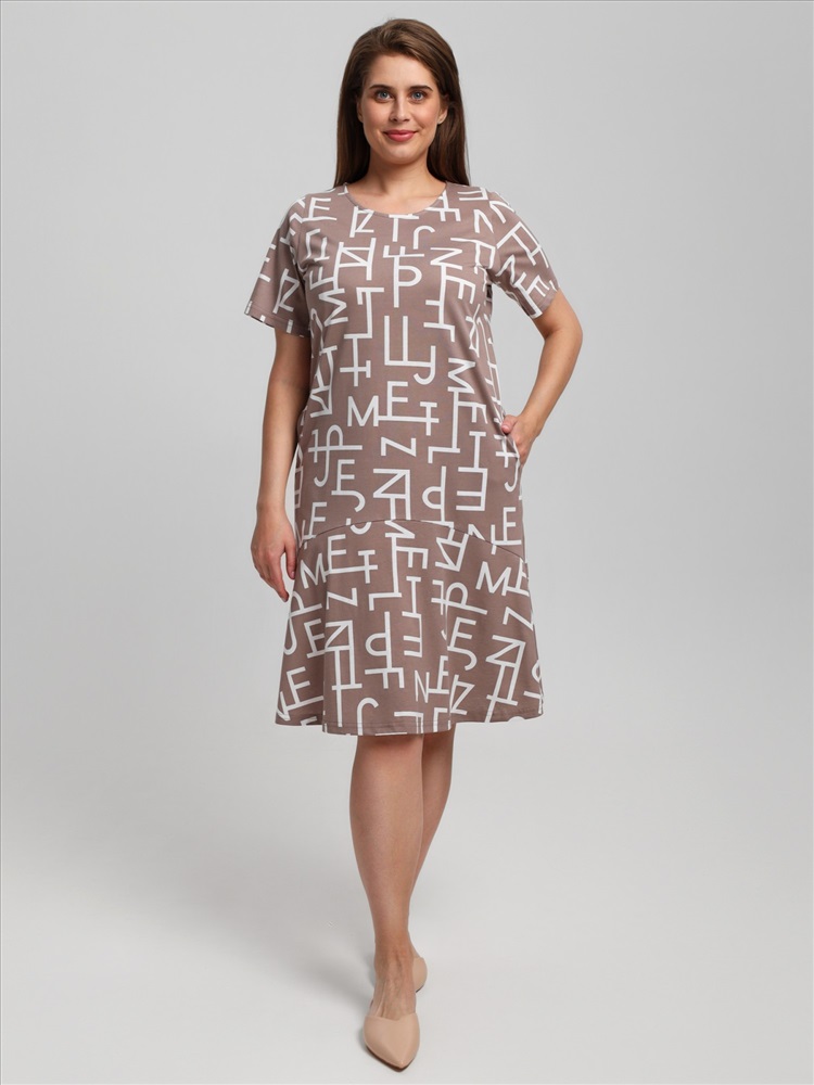 Платье женское из трикотажного полотна «кулирка» с набивным рисунком, полуприталенного силуэта, с короткими втачными рукавами, горловиной овальной формы, карманами в боковых швах. Низ изделия с воланом ассиметричной формы.