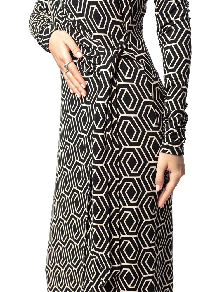 Платье на запАх сшито из трикотажной вискозы с эластаном. V-вырез с мини-копкой на борте с внутренней стороны для фиксации выреза декольте. Запах сходится и завязывается на боковой-пояс ленту. Модель подчеркивает достоинства и изгибы фигуры. А геометрический принт скрывает любые неровности. Роскошь и комфорт, одновременно подчеркивающие стиль, женственность и красоту.