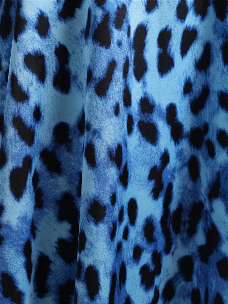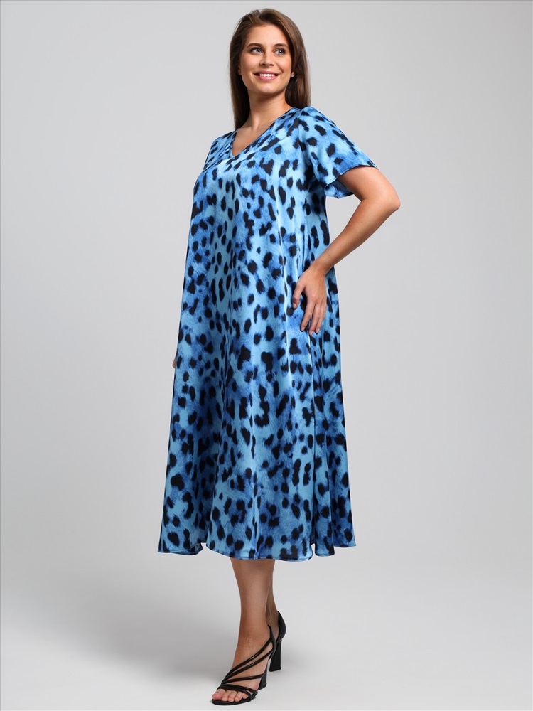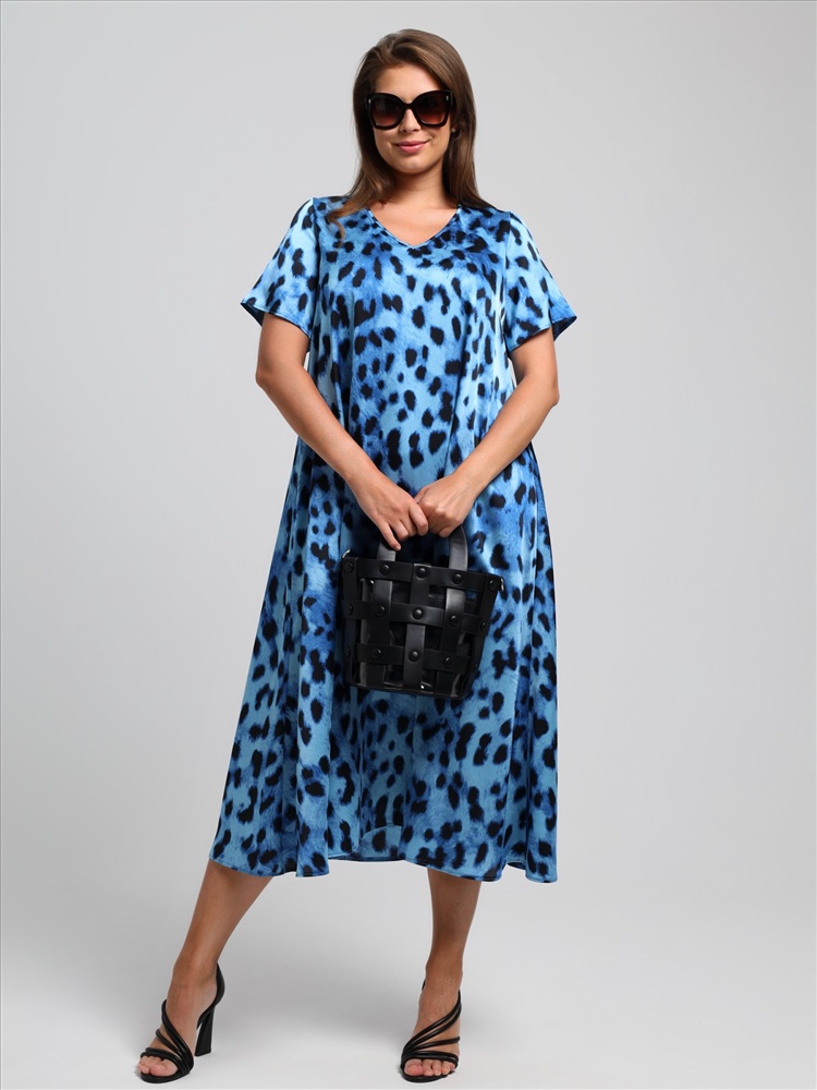 Платье женское из тканого полотна «искусственный шёлк полиэстер» с набивным рисунком, свободного покроя, удлиненное, по боковым швам расклешенное книзу, с V-образным вырезом горловины, окантованным основным материалом и короткими втачными рукавами.