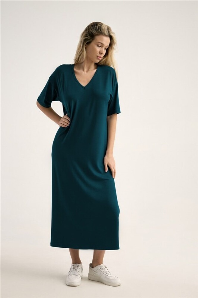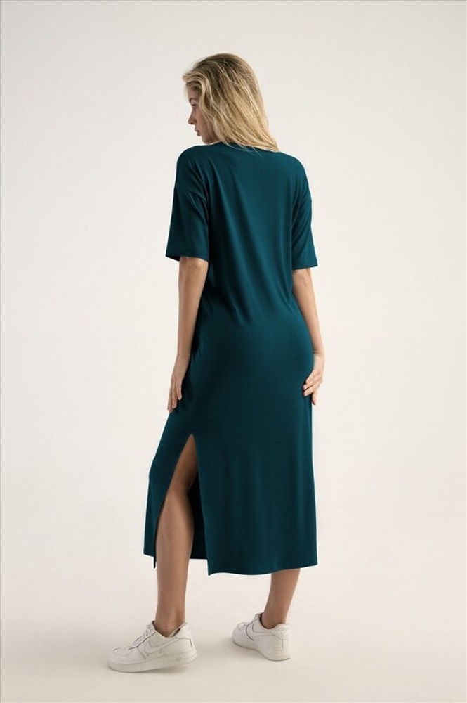 Платье с высоким разрезом в левом боковом шве. Спущенное плечо.Втачной короткий рукав. V- вырез.Горловина окантована бейкой из основной ткани.