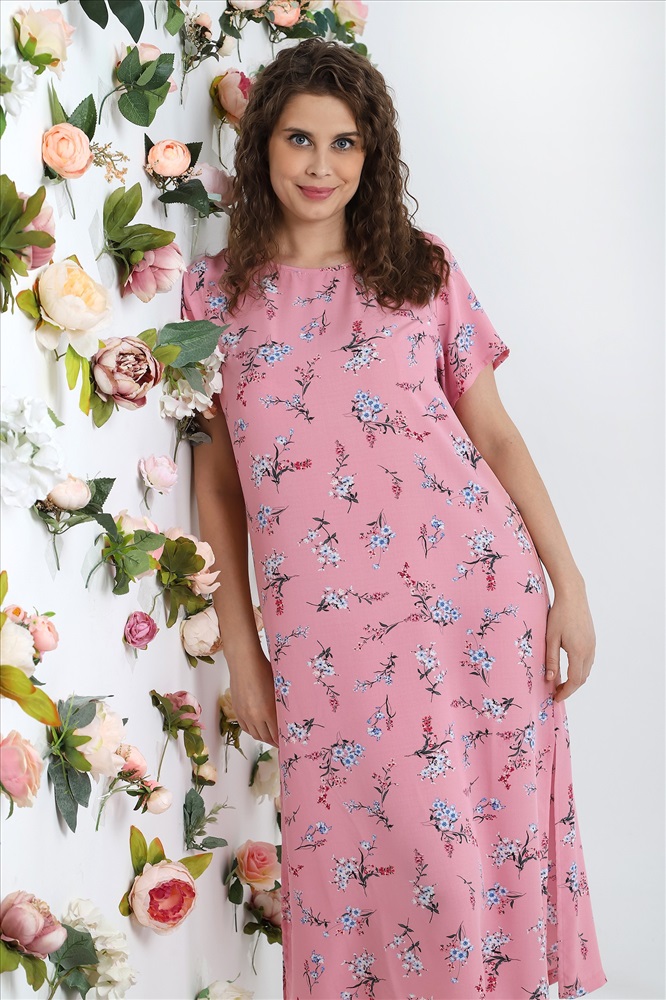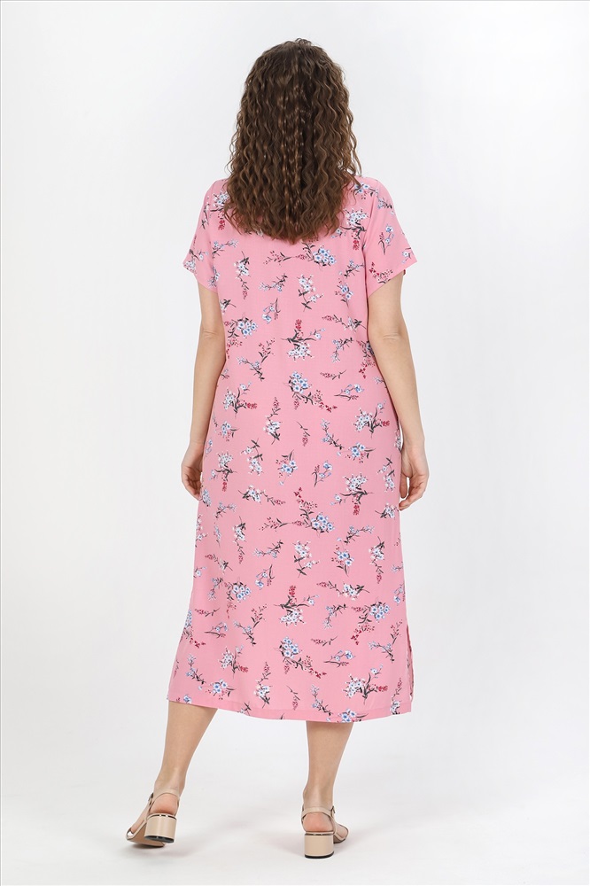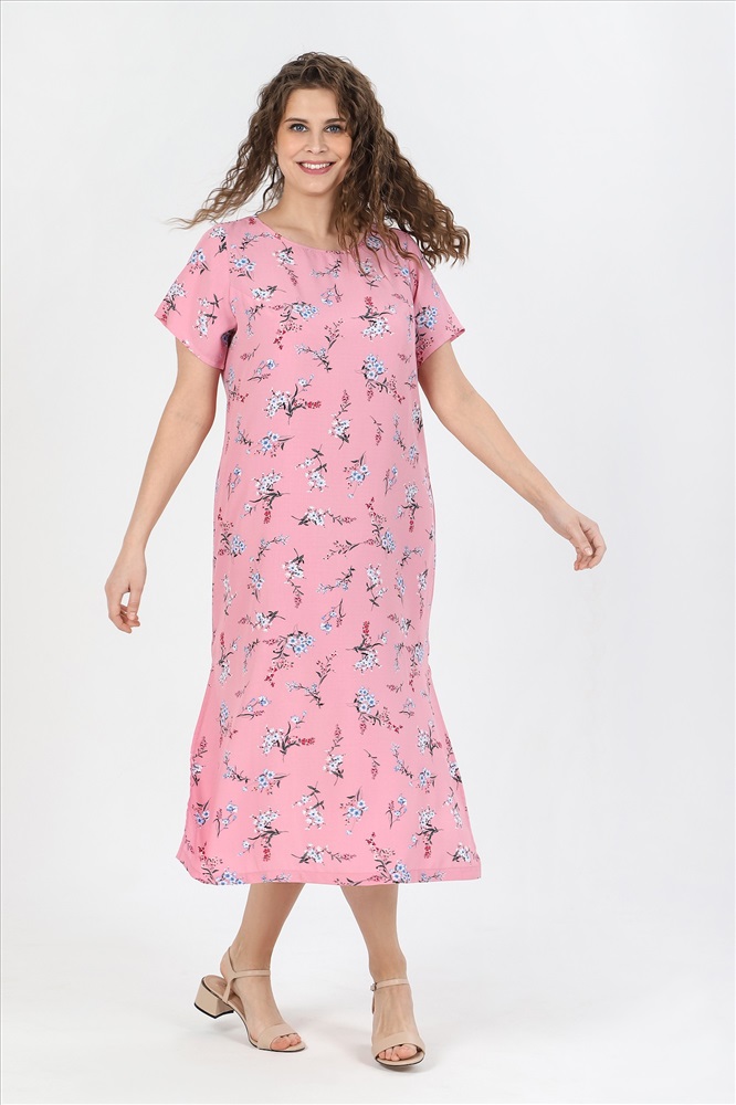 Платье женское из штапельной плательной ткани с набивным рисунком полуприлегающего силуэта, с короткими втачными рукавами, горловиной овальной формы, окантованной основным материалом. В области груди обработаны две вытачки, в боковых швах выполнены разрезы.
