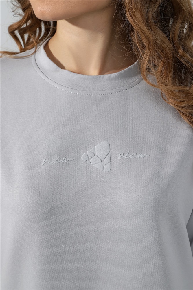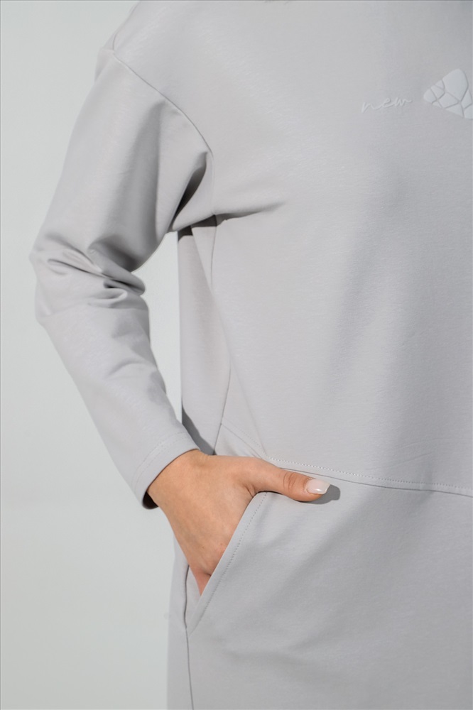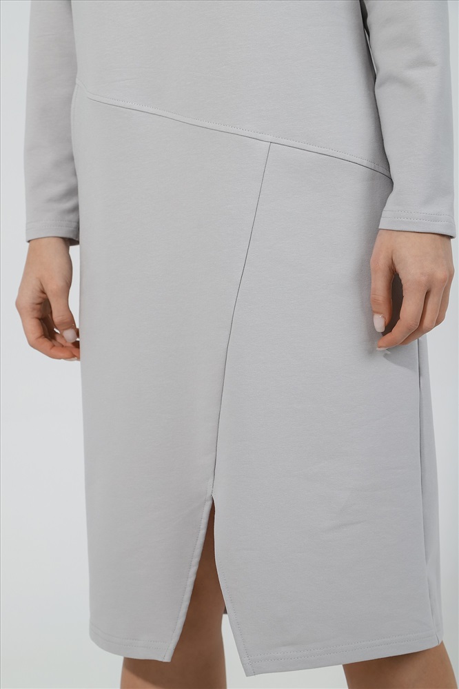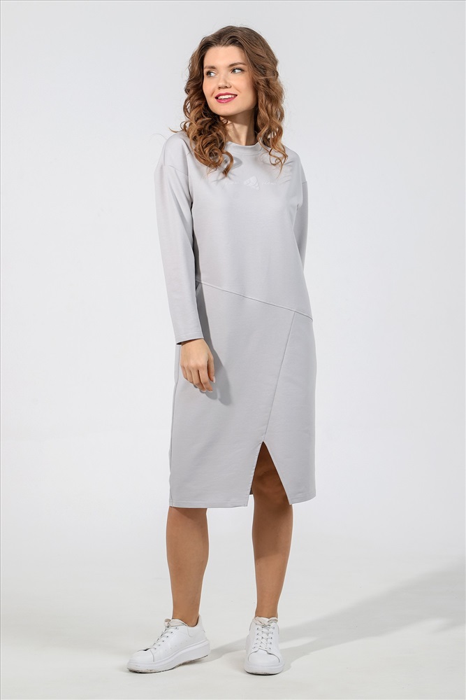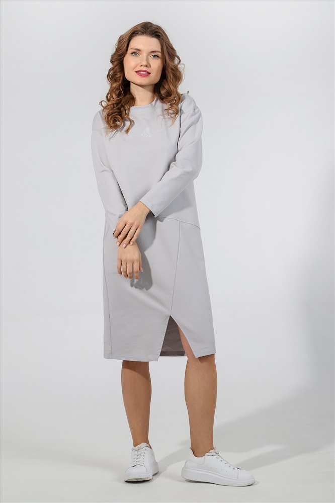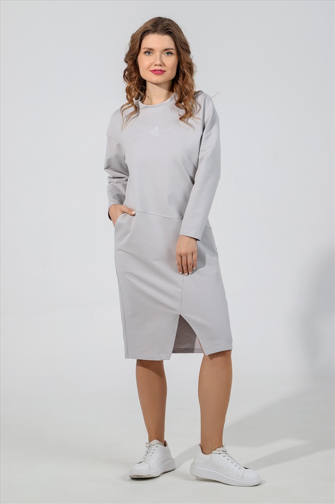 Платье молодежное из гладкокрашеного трикотажного полотна «футер-двунитка», удлиненное, прямого силуэта, с длинными втачными рукавами, горловиной овальной формы, обработанной втачной планкой, и принтом на полочке, выполненным в технике шелкографии. Перед – их трех частей, с одним карманом в правом боковом шве и разрезом V-образной формы в шве соединения двух нижних деталей между собой.