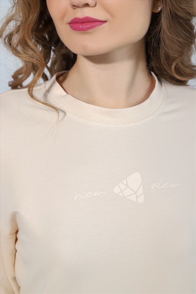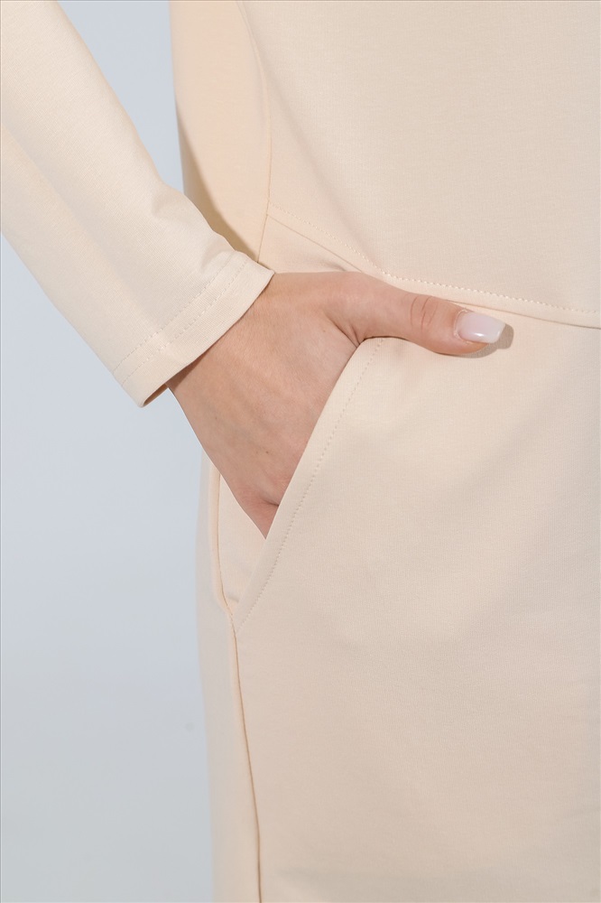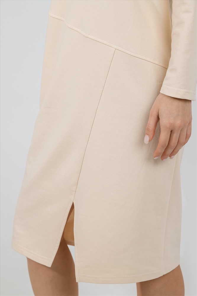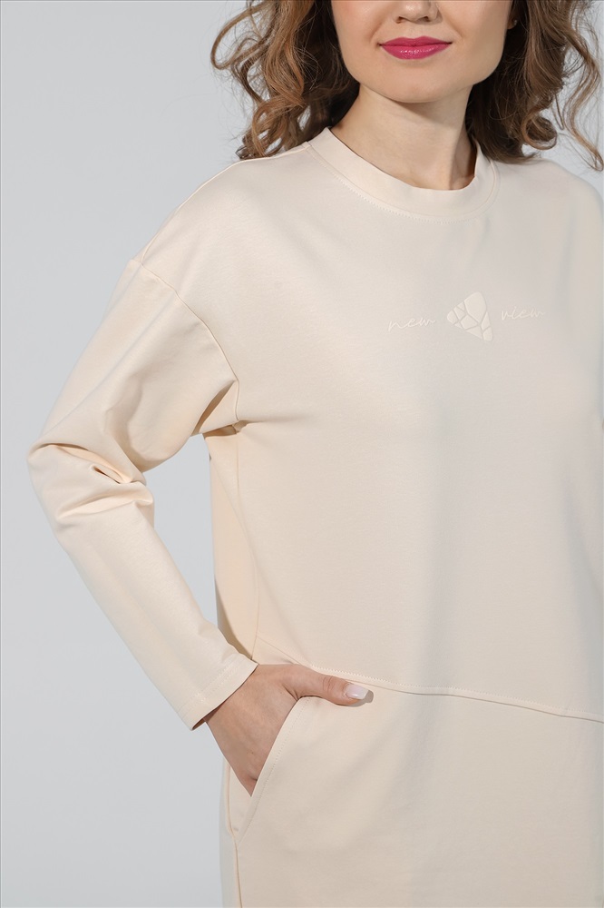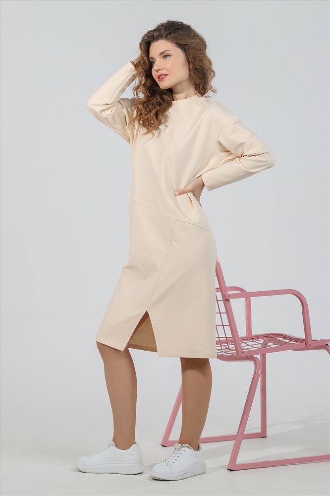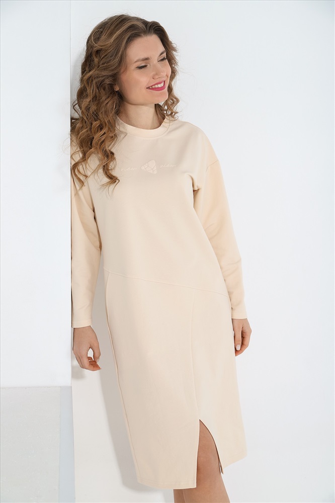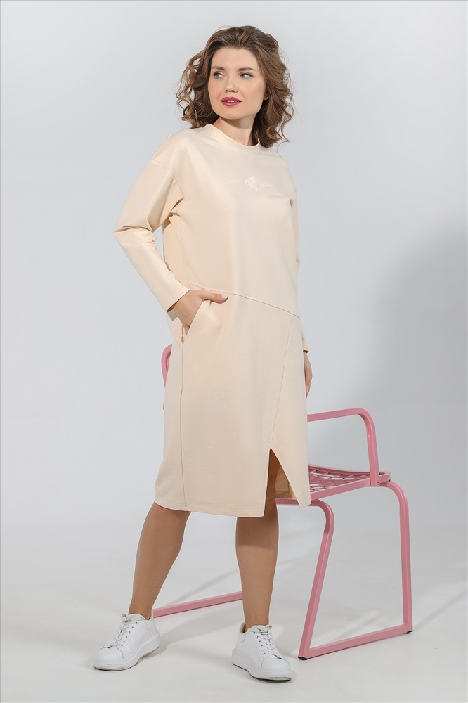 Платье молодежное из гладкокрашеного трикотажного полотна «футер-двунитка», удлиненное, прямого силуэта, с длинными втачными рукавами, горловиной овальной формы, обработанной втачной планкой, и принтом на полочке, выполненным в технике шелкографии. Перед – их трех частей, с одним карманом в правом боковом шве и разрезом V-образной формы в шве соединения двух нижних деталей между собой.