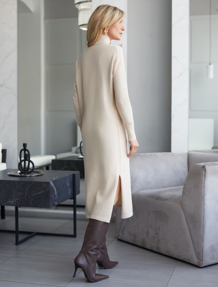 Размер товара на первом фото: 42 Платье тонкой вязки выполнено из хлопка. Лаконичная модель с высоким воротом дополнена манжетами и разрезами по бокам. Изделие свободно сидит по фигуре и не сковывает движений. Мягкая пряжа очень приятная к телу не колется и сохраняет тепло при этом не перегревая. Изделие дополнено металлическим логотипом бренда.