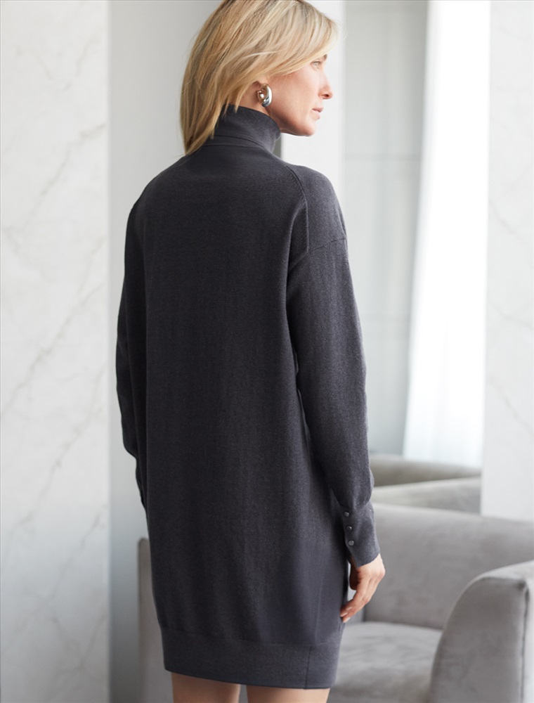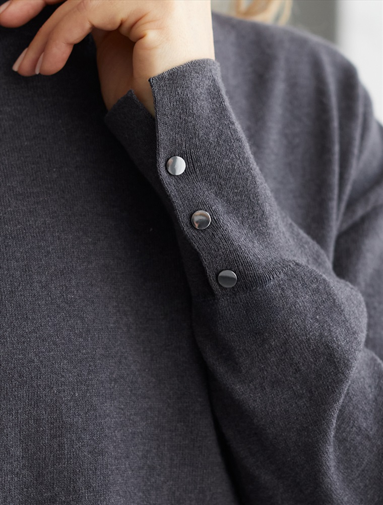 Платье тонкой вязки выполнено из хлопка. Лаконичная модель с высоким воротом как у водолазки дополнена манжетами с золотистыми пуговицами. Изделие свободно сидит по фигуре и не сковывает движений. Мягкая пряжа очень приятная к телу не колется и сохраняет тепло при этом не перегревая.