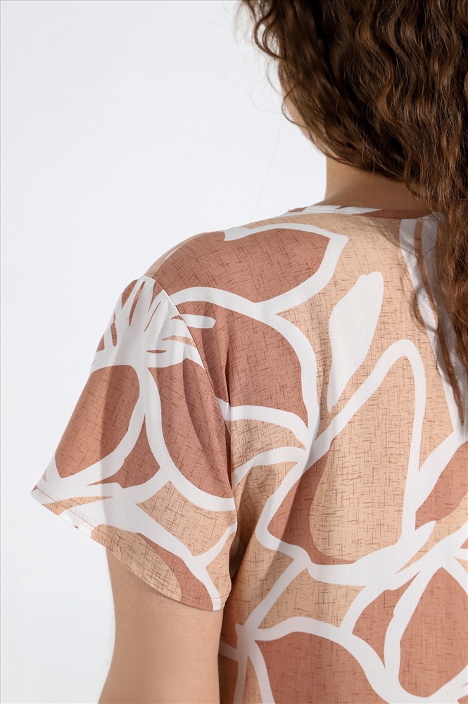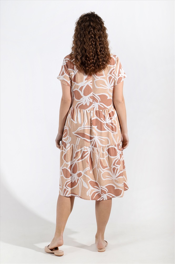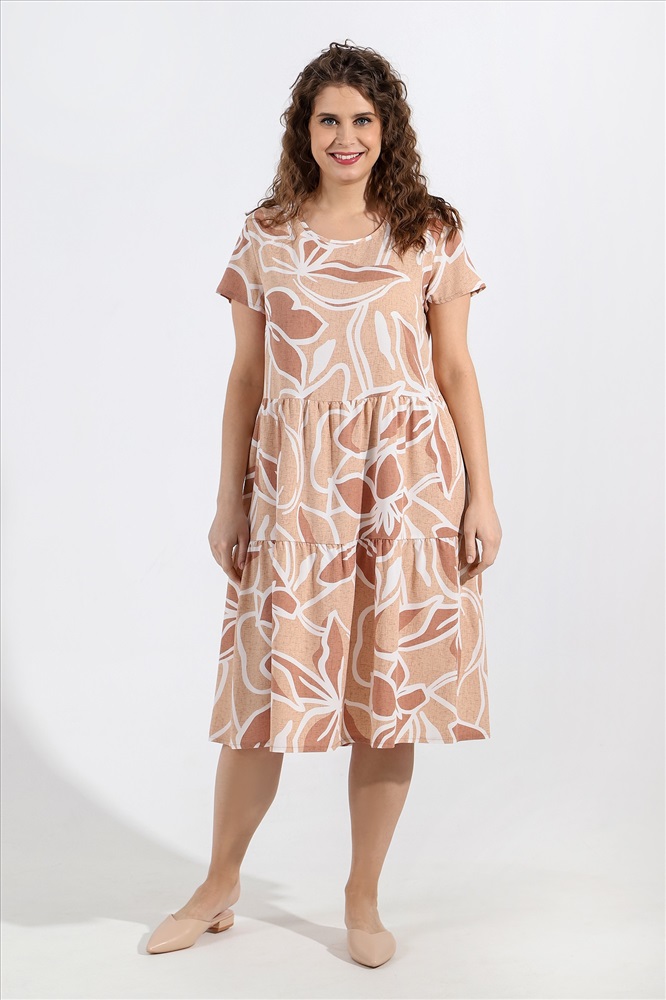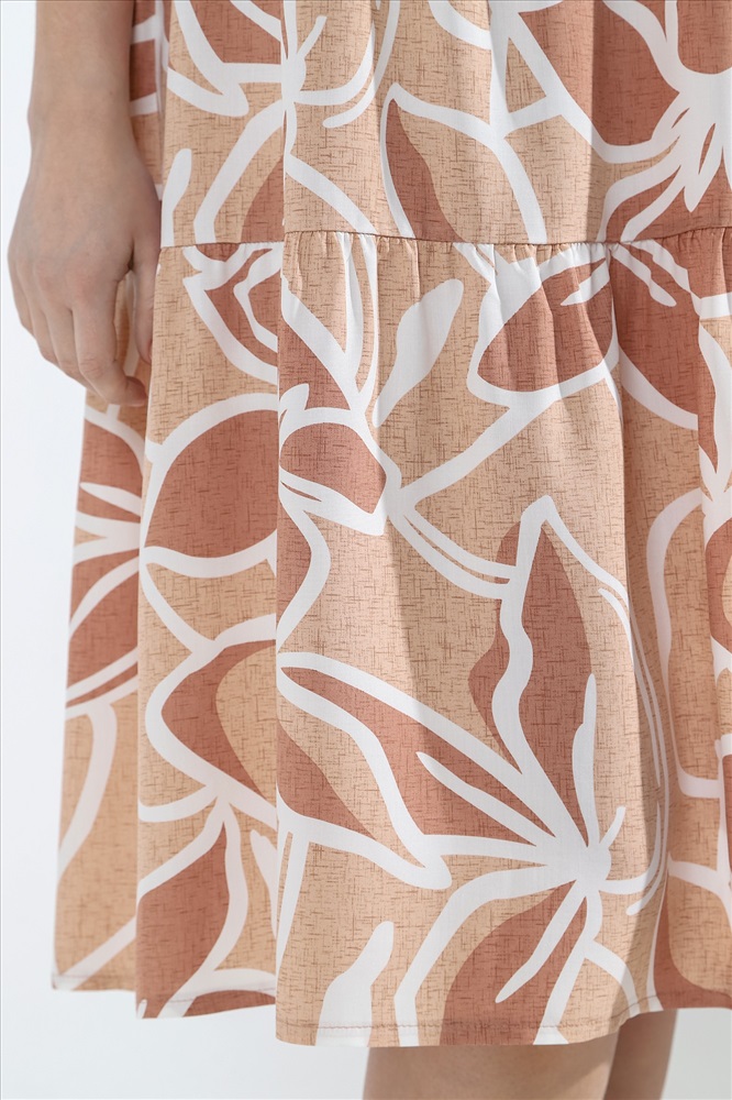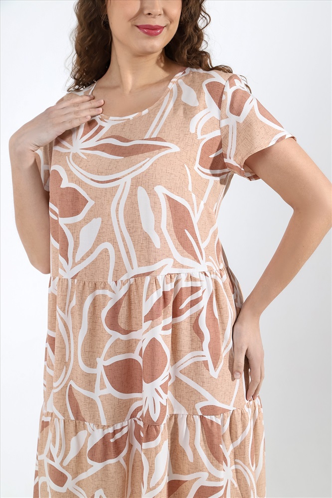 Ткань: Штапель Платье из плательной штапельной ткани с набивным рисунком, свободного покроя, отрезное по линии талии, с короткими втачными рукавами и горловиной овальной формы, обработанной обтачкой. Полочка – с вытачками в области груди. Юбка – из двух ярусов, каждый из которых присборен по шву соединения с верхней деталью.