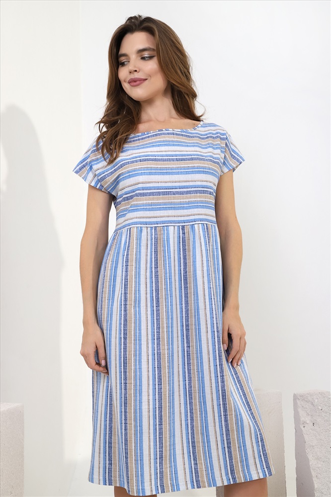 Платье молодежное из полотна «кулирка» в полоску, отрезное по линии талии, с широкой юбкой на сборке, короткими цельнокроеными рукавами, горловиной овальной формы, окантованной основным материалом, с карманами в боковых швах.