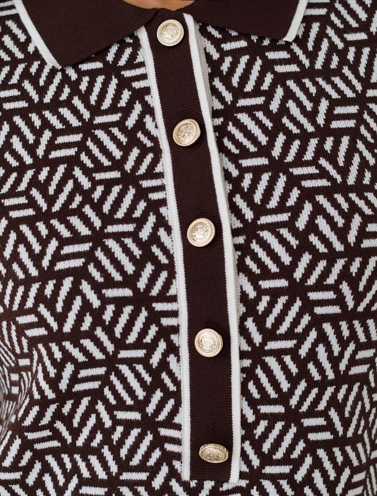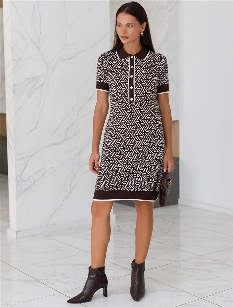 Параметры модели на первом фото: Рост 170, бюст 83, талия 64, бедра 88 Платье жаккардовой вязки выполнено из нежной пряжи на основе вискозы с добавлением кашемира. Модель прямого силуэта с застежкой планкой как у поло. Фигурные золотистые пуговицы вносят изысканности и роскоши. Изделие приятно ощущается на теле и поддерживает комфортный микроклимат. Сочетается в комплекте total-look с жакетом D31.150