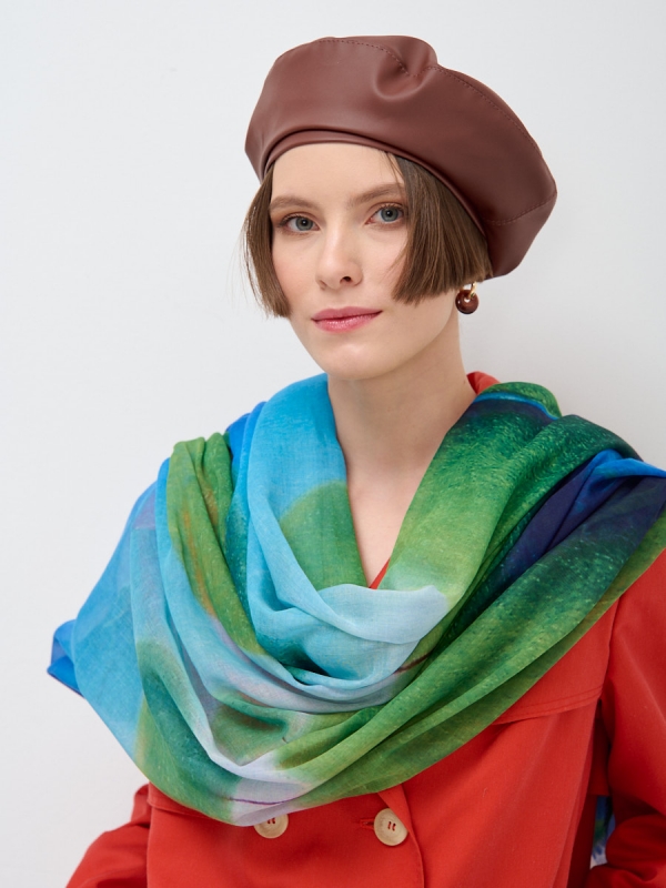 Большой, красивый двусторонний платок с рисунком в стиле "арт-деко"и необычной текстурой ткани. Края изделия украшены бахромой. Только ручная стирка.
