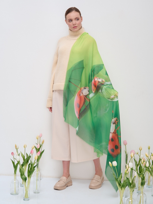 Цвет: Зеленый Большой, красивый двусторонний платок с рисунком в стиле "арт-деко"и необычной текстурой ткани. Края изделия украшены бахромой. Только ручная стирка.