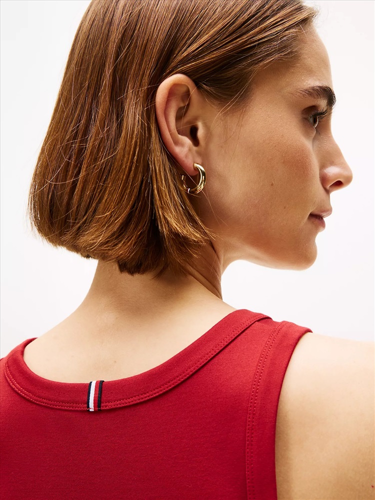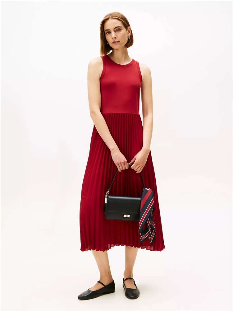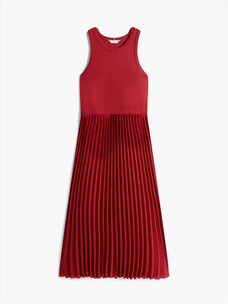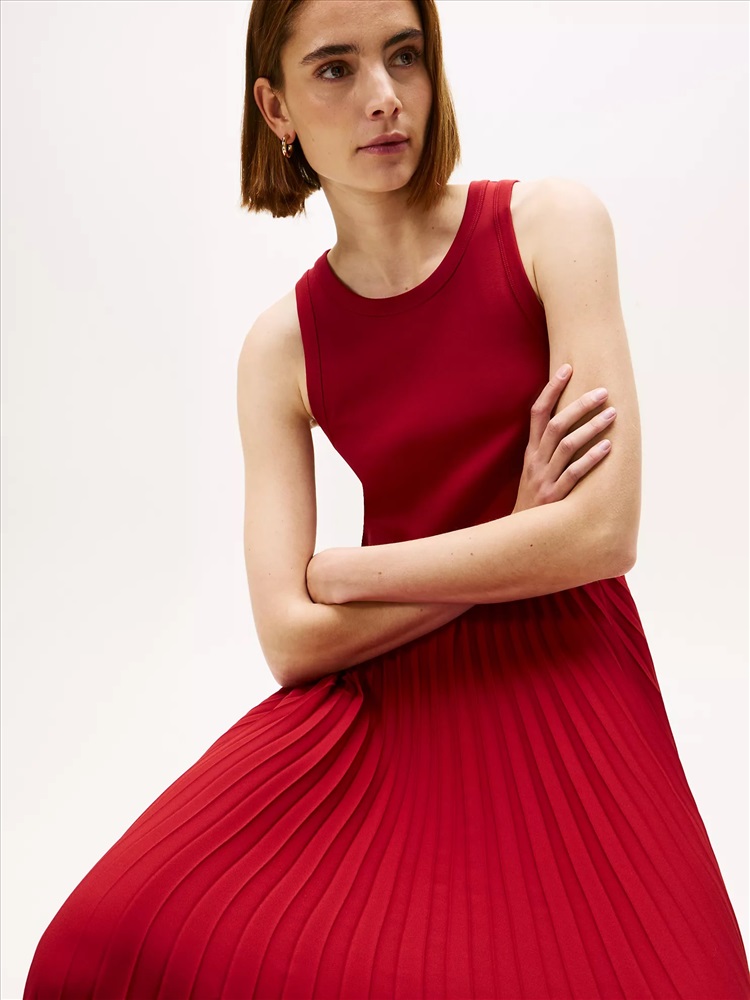 Tommy Hilfiger women's dress. Our sleeveless tank dress is designed with a comfortable, form-fitting jersey bodice. The skirt is structured with a stretchy waist and sunray pleats for contrasting texture and movement.