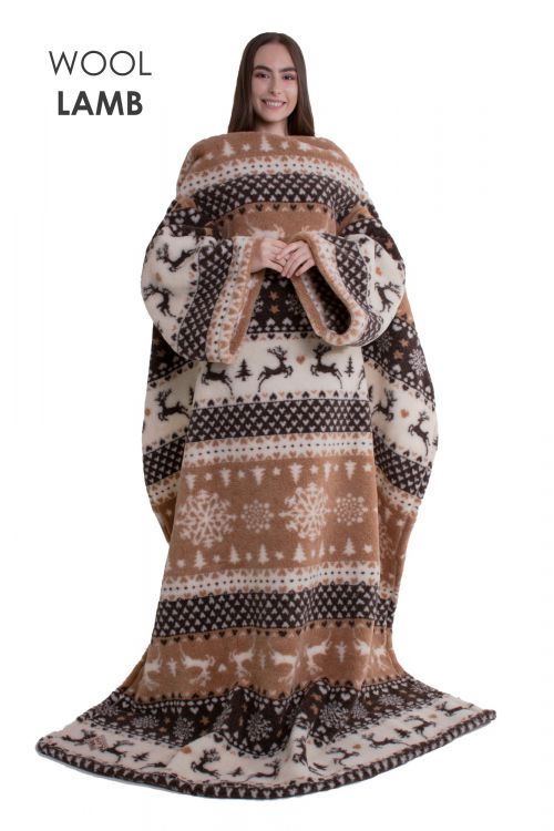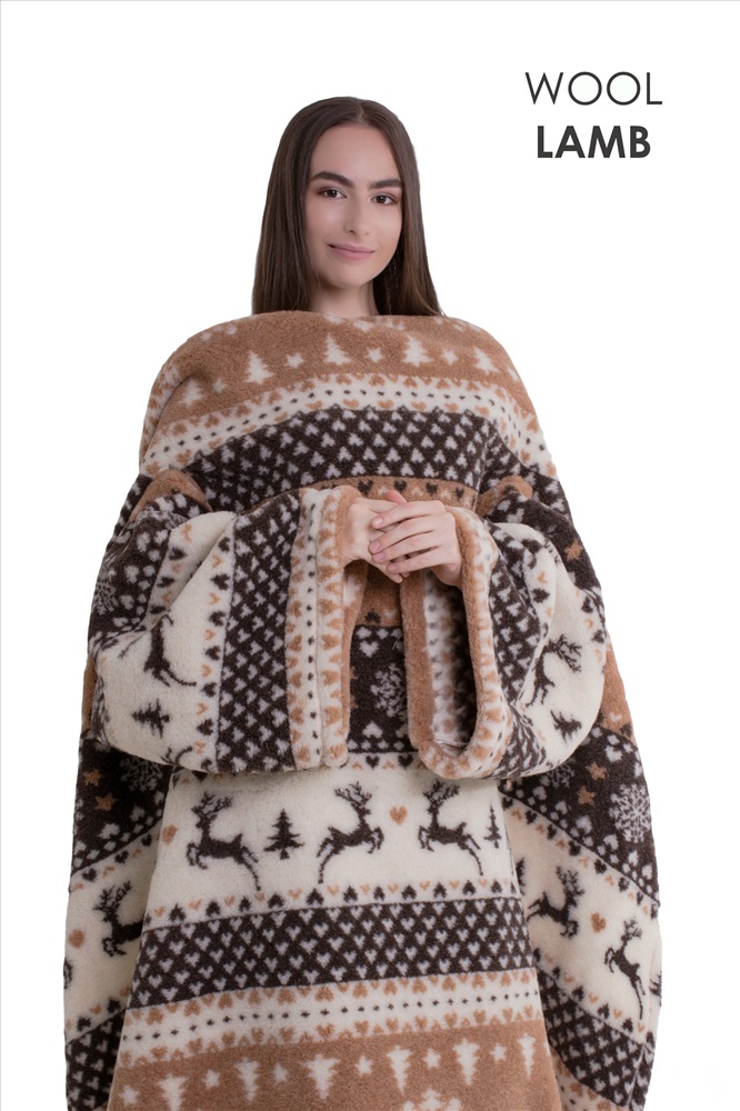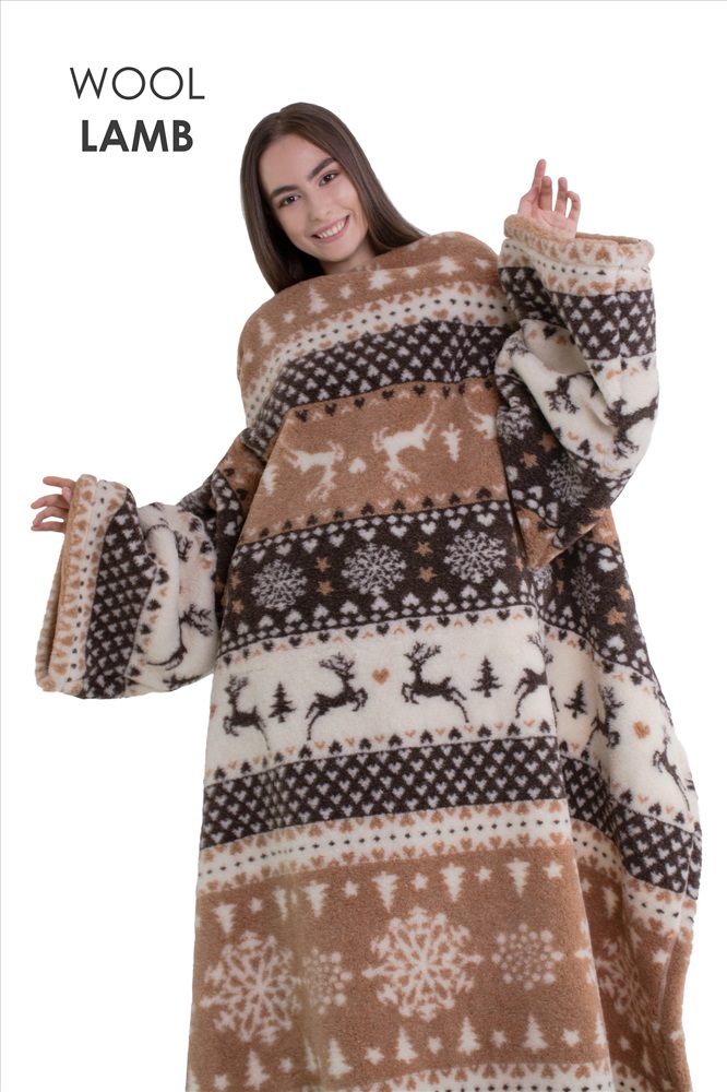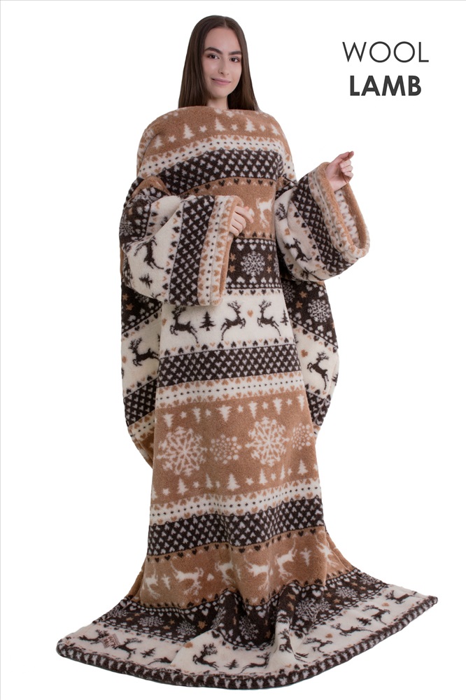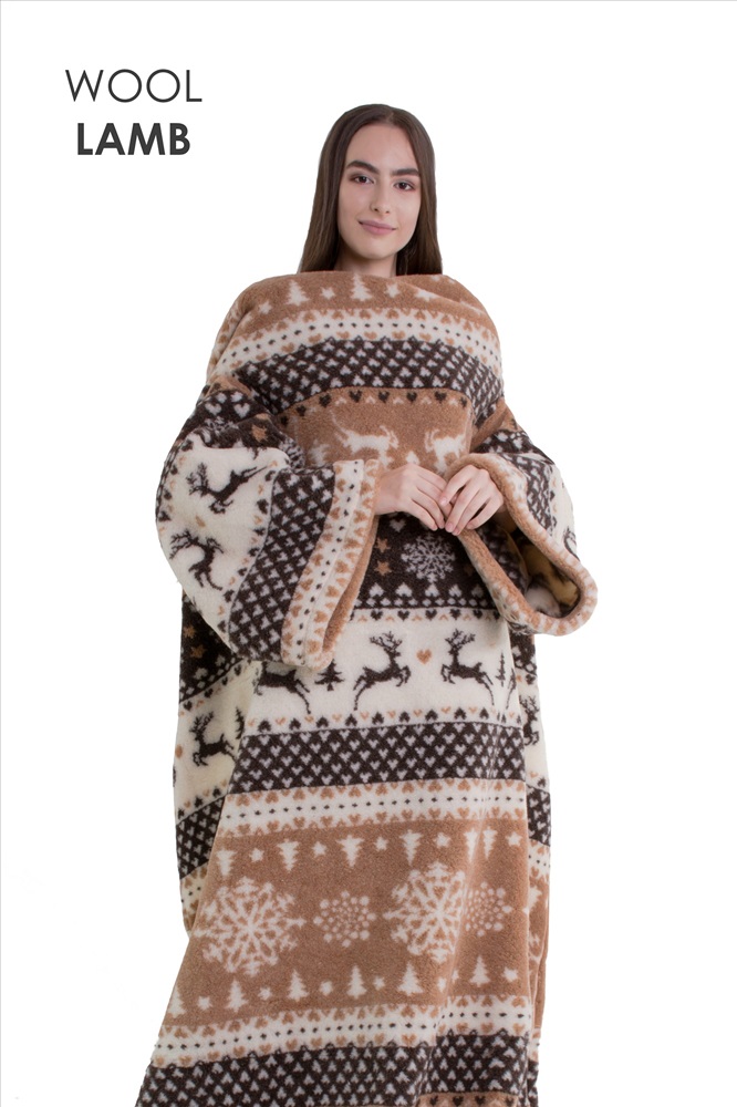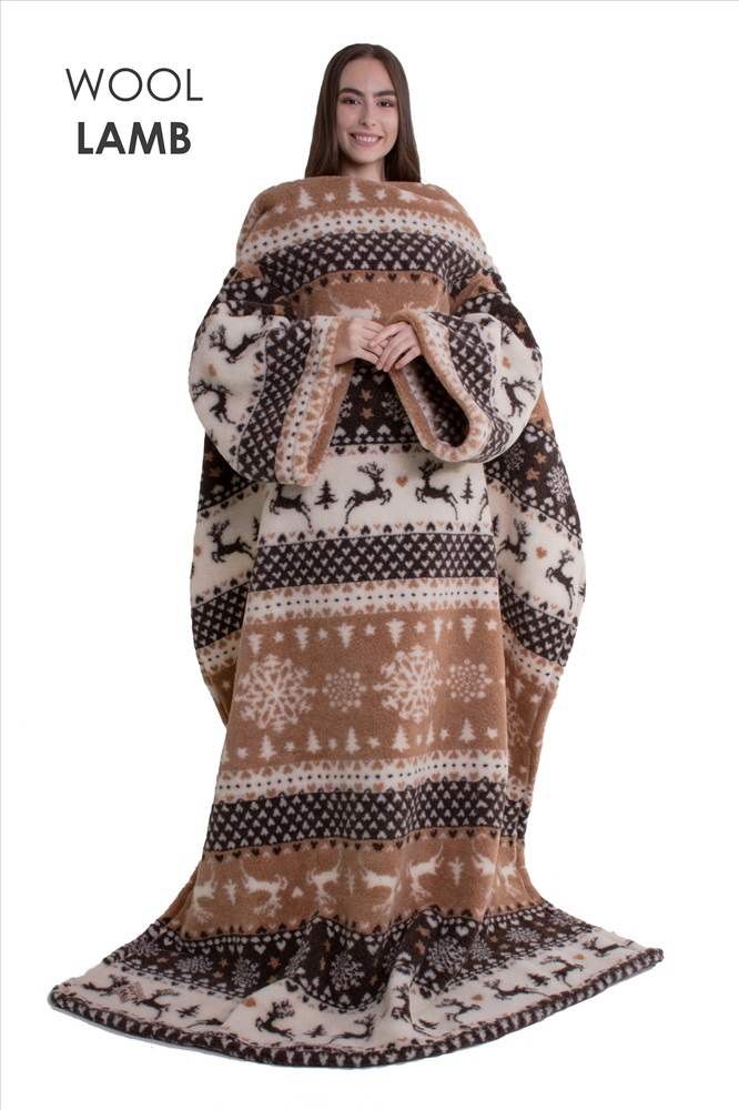Плед меховой , выполнен из натуральной овечьей шерсти, плотность меха 550 гр/м, высота ворса 12 мм, с внутренней стороны шерстяной начёс, размер 150*200 см, длина рукава 50 см