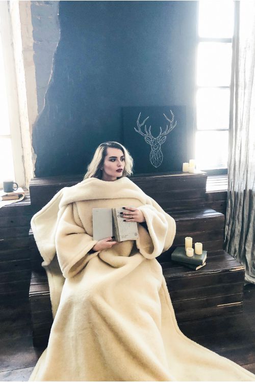 Плед меховой , выполнен из натуральной овечьей шерсти, плотность меха 550 гр/м, высота ворса 12 мм, с внутренней стороны шерстяной начёс, размер 150*200 см, длина рукава 50 см