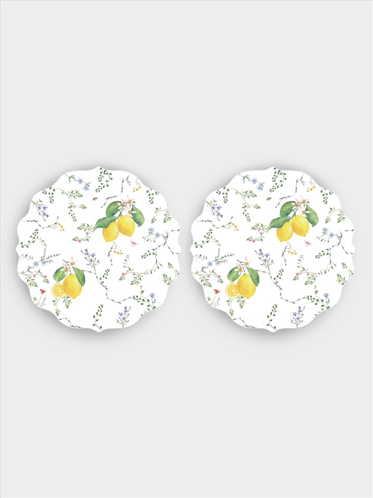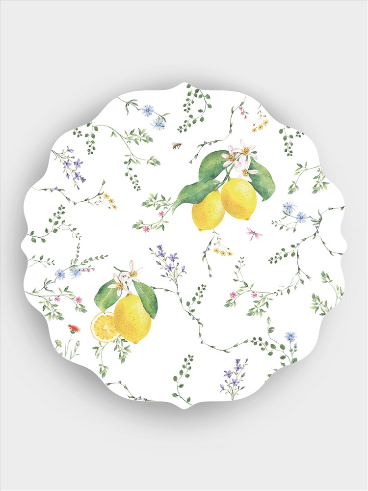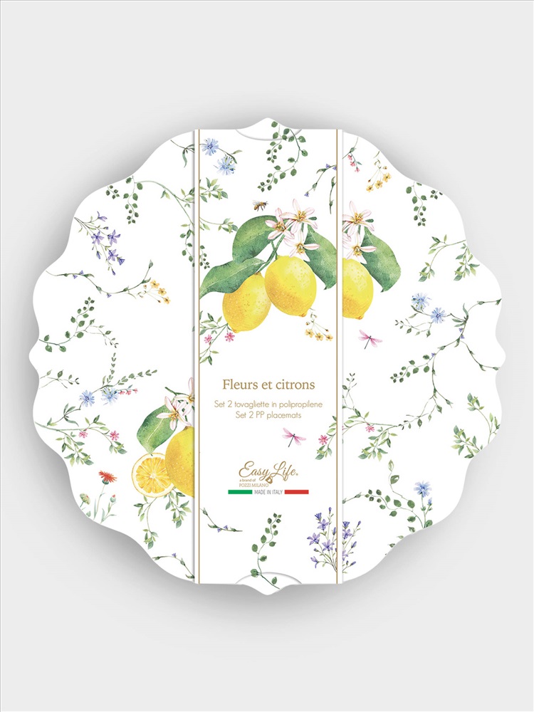 Подставка под горячее, 34,5 см, 2 шт, пластик, круглая, белая, Цветы и лимоны, Fleurs et Citrons. Материал: пластик. Термостойкость до 60 градусов Цельсия. Протирать влажной салфеткой.